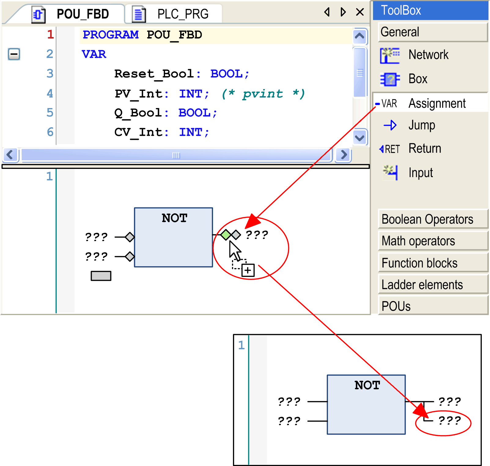 The FBD/LD/IL Editor provides a toolbox which offers the programming elements for being inserted in the editor window by drag and drop. Open the toolbox by executing the command which is in the menu.