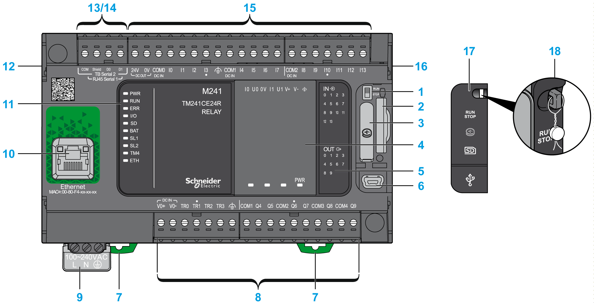 USB mini-B programming port / For terminal connection to a programming PC (EcoStruxure Machine Expert) |