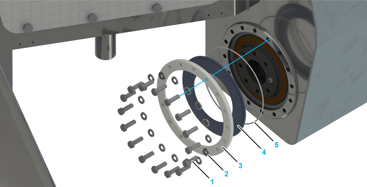 Remove the 16 screws (1) and washers (2) and then remove the supporting ring (3), the protector cap (4), and the O-ring (5) from each of the three housing flanges. ![]() |