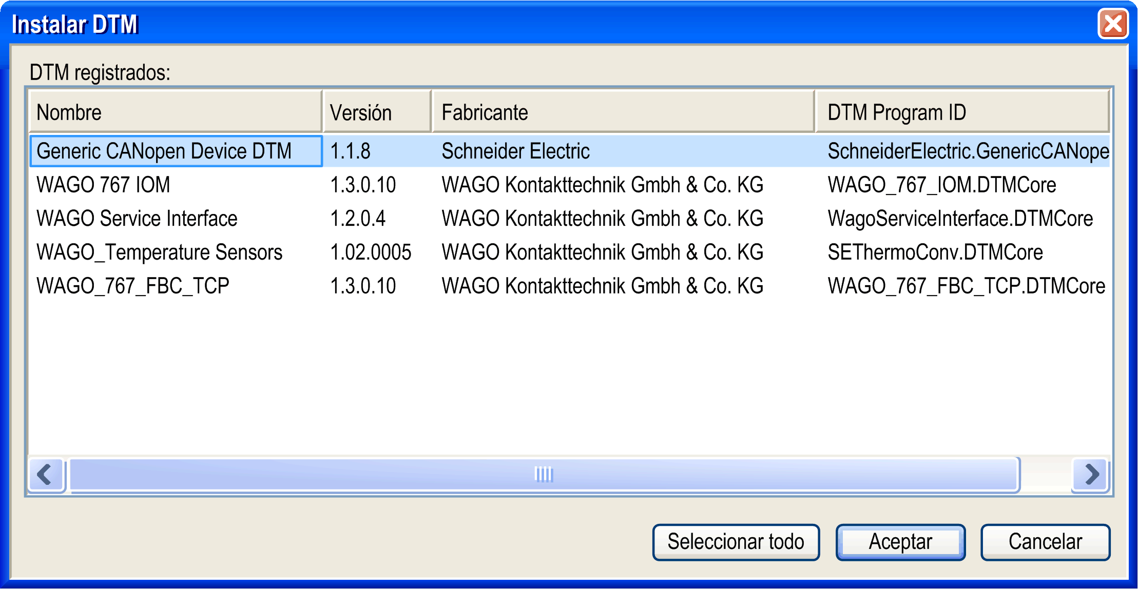 , , y . Para instalar los DTM en el repositorio de dispositivos, seleccione el DTM que desee y haga clic en el botón .
