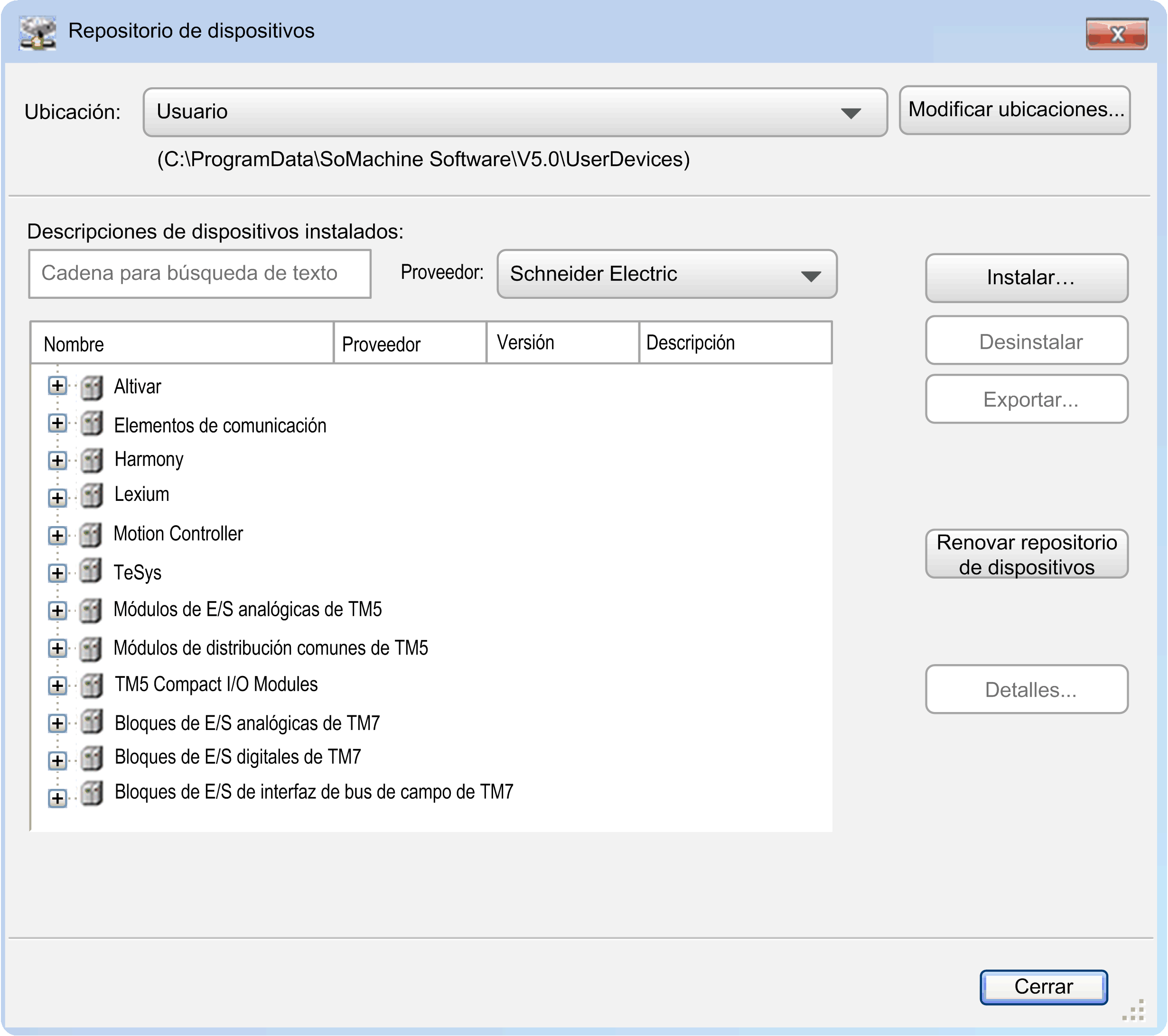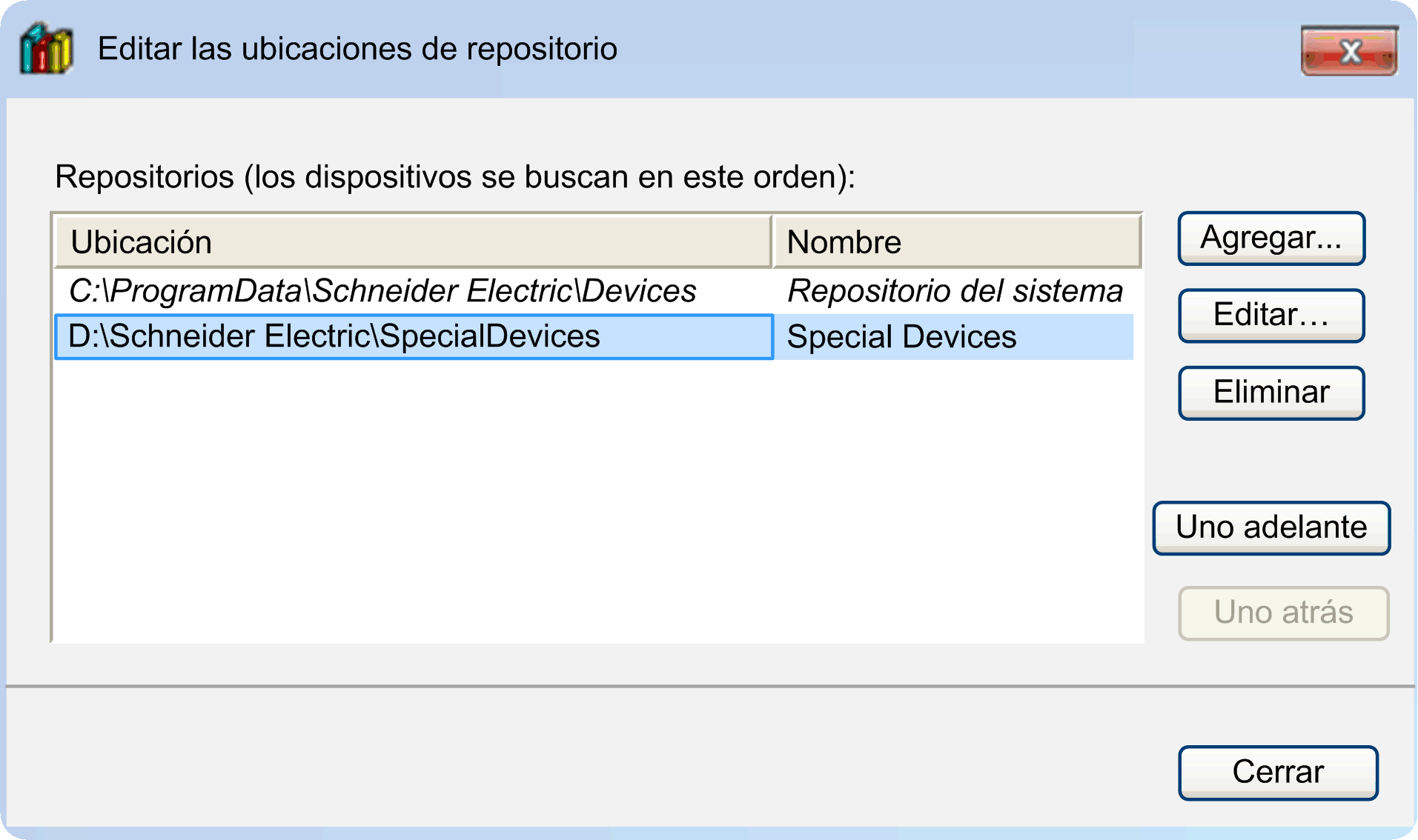 Los repositorios de dispositivos pueden estar disponibles en varias ubicaciones del sistema. La lista de selección ofrece las ubicaciones disponibles actualmente. De forma predeterminada, se proporciona el . |