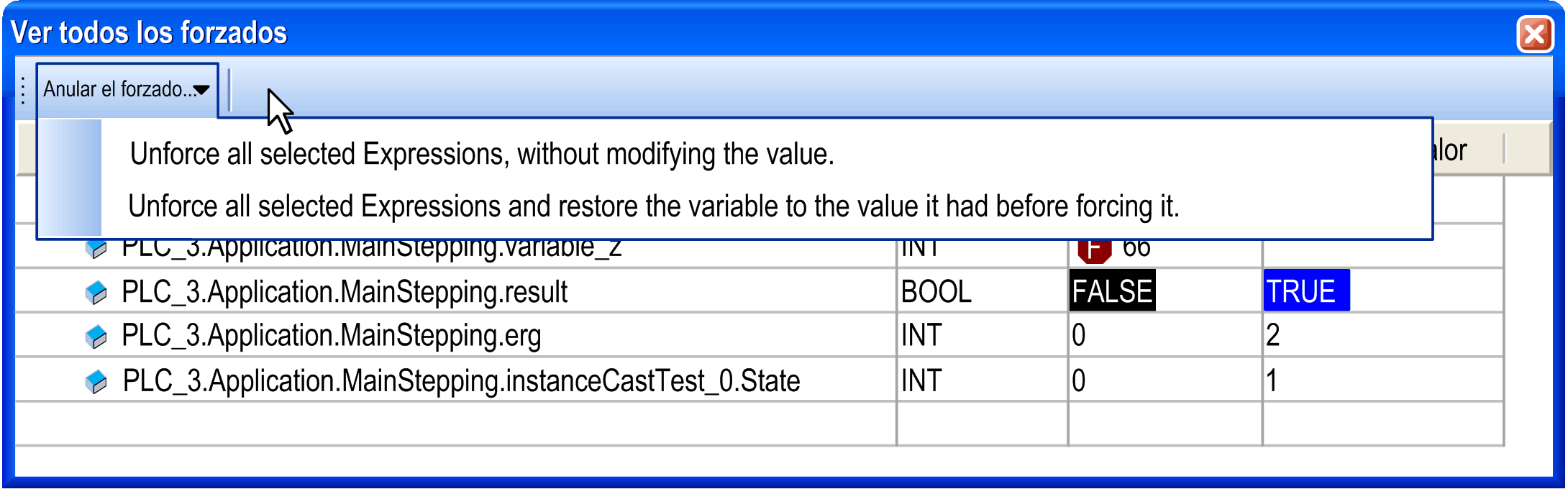 , puede introducir el valor deseado que se escribirá o forzará en la expresión correspondiente en el controlador mediante el comando o . Consulte las descripciones de los comandos y , que también se pueden utilizar en otras vistas de supervisión (por ejemplo, el editor de declaraciones).Esta es una vista de lista de supervisión especial, que en la modalidad en línea se rellena automáticamente con todos los valores actuales forzados de la aplicación activa. Se mostrará cada