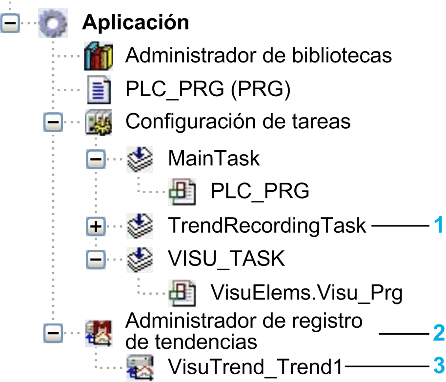 Para insertar un objeto de registro de tendencias en el Esta función no está disponible para todos los controladores admitidos. Consulte la guía de programación específica de su controlador para obtener más información. En este ejemplo, se añaden un y un objeto del tipo como subnodos al nodo .