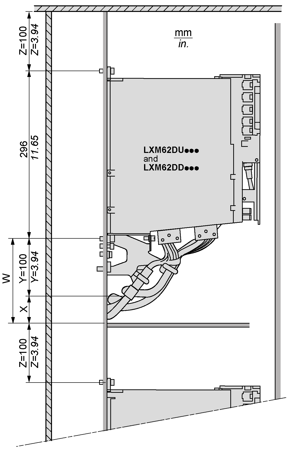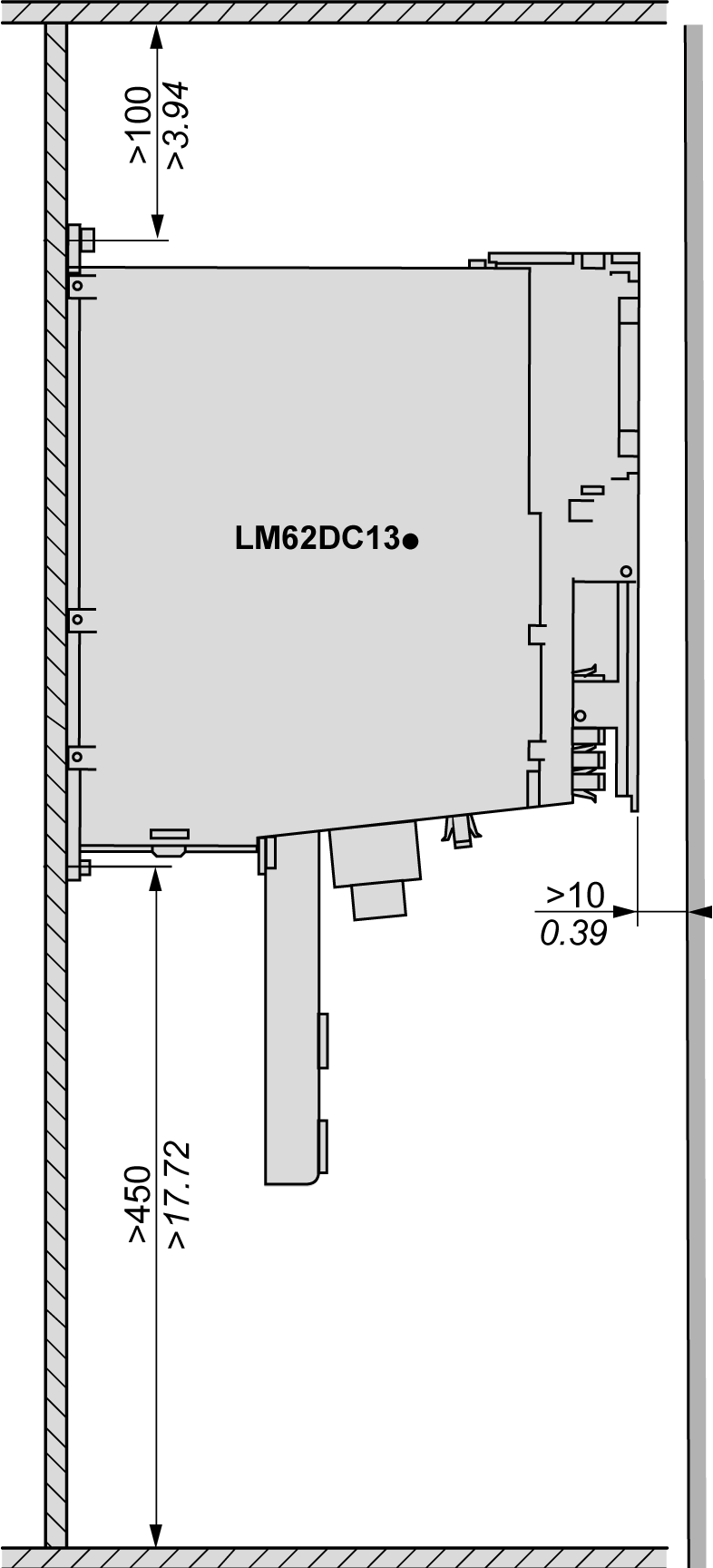Distancias requeridas en el armario eléctrico para el accionamiento simple LXM62DC13: