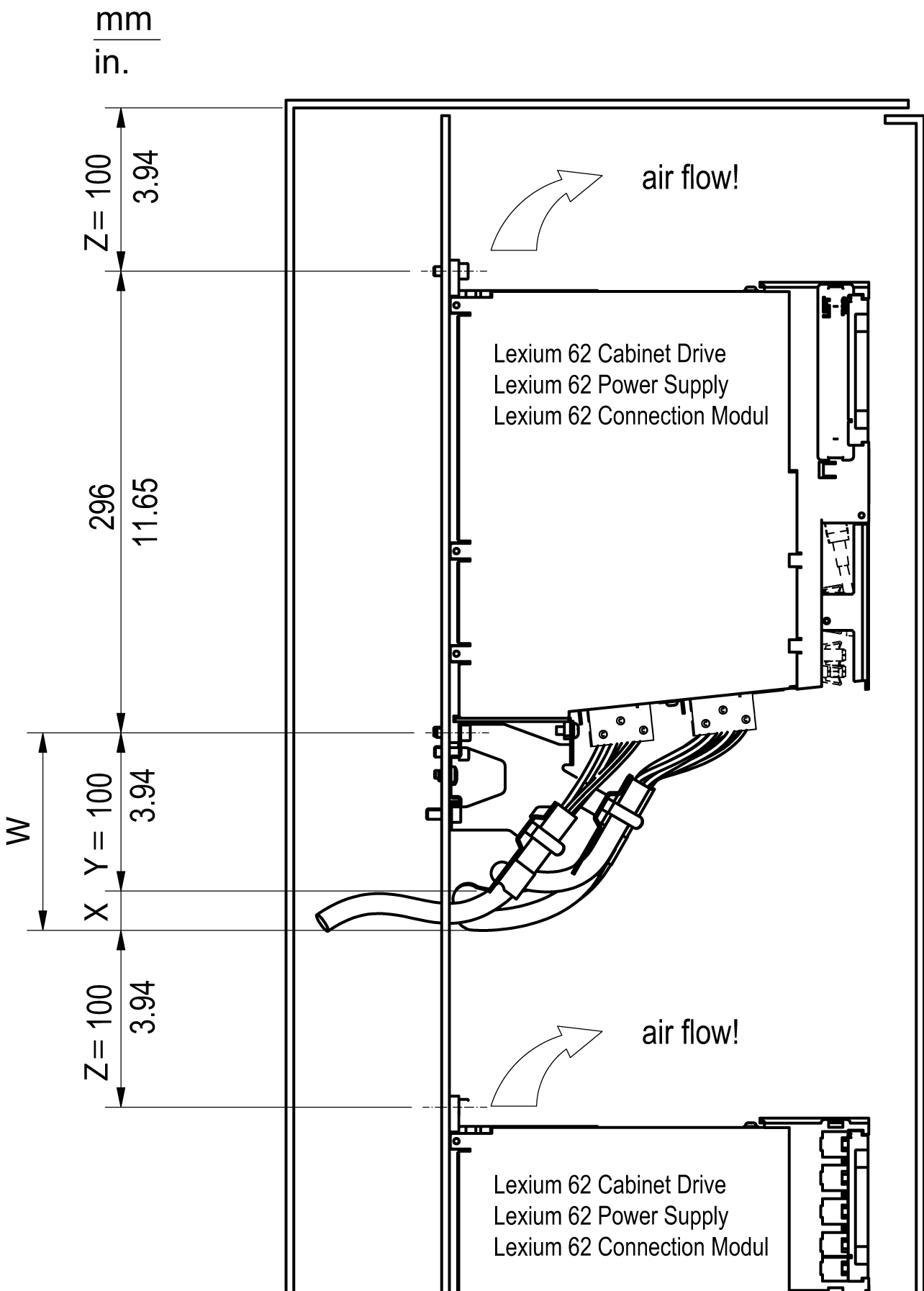 Distancias requeridas en el armario eléctrico para el PacDrive LMC Pro/Pro2, Lexium 62 Power Supply, Lexium 62 Servo Drive: