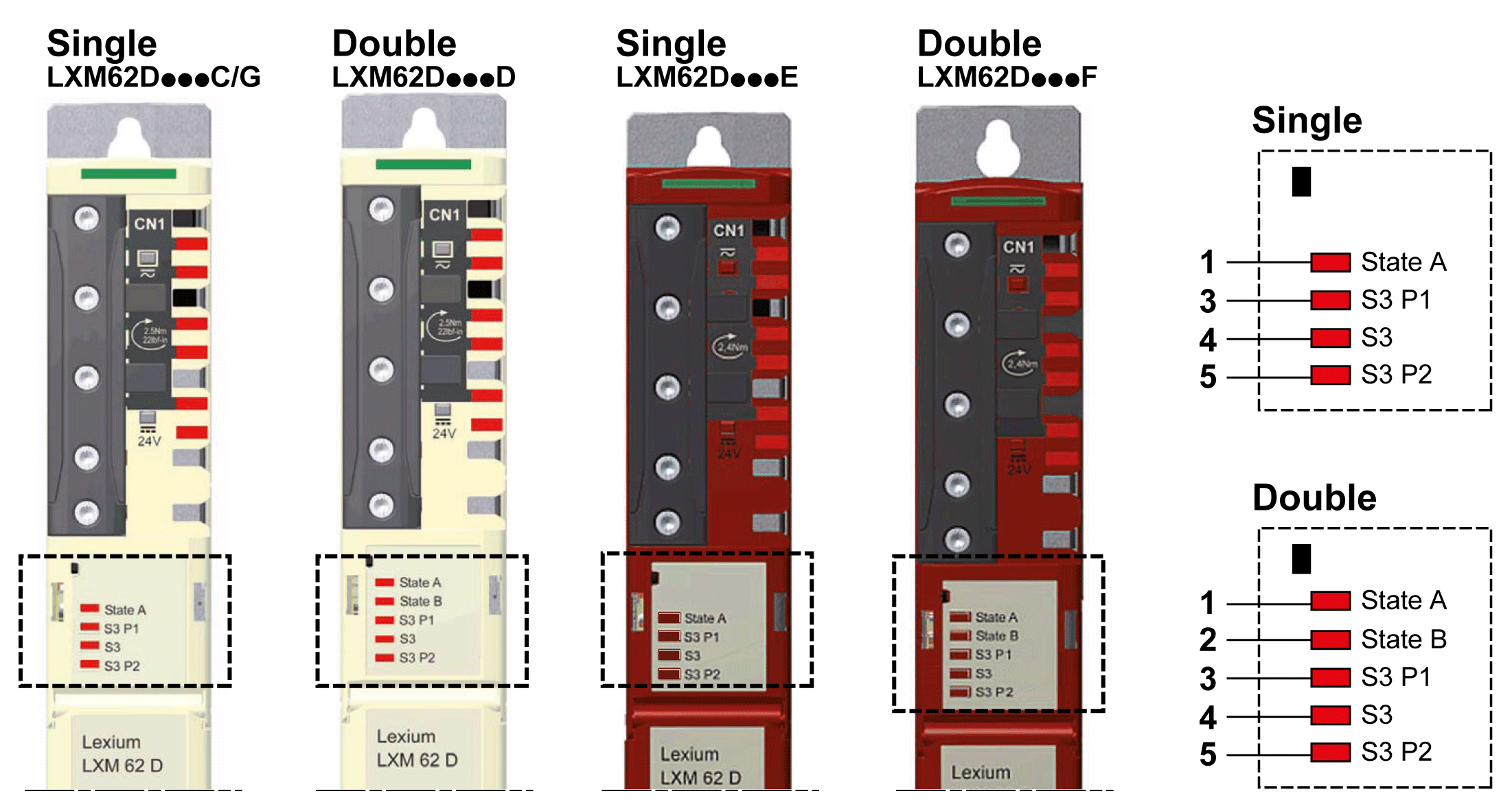 La pantalla del Lexium 62 Servo Drives contiene indicadores LED de varios colores que se utilizan para mostrar información sobre el estado del sistema.