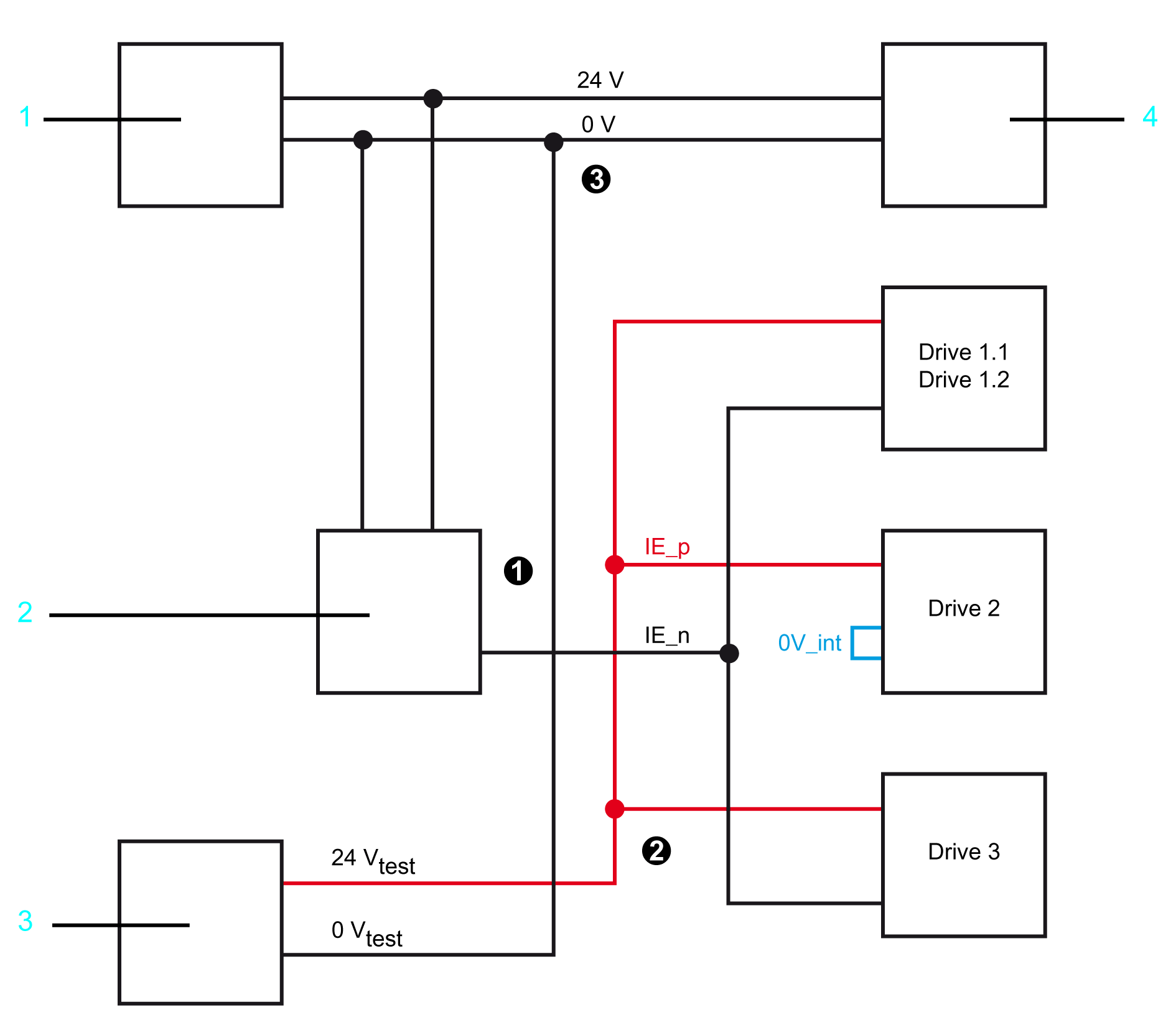 Desconecte la conexión IE_p (24 V) para los accionamientos en el dispositivo de conmutación de seguridad (consulte el paso 1 del siguiente gráfico). |