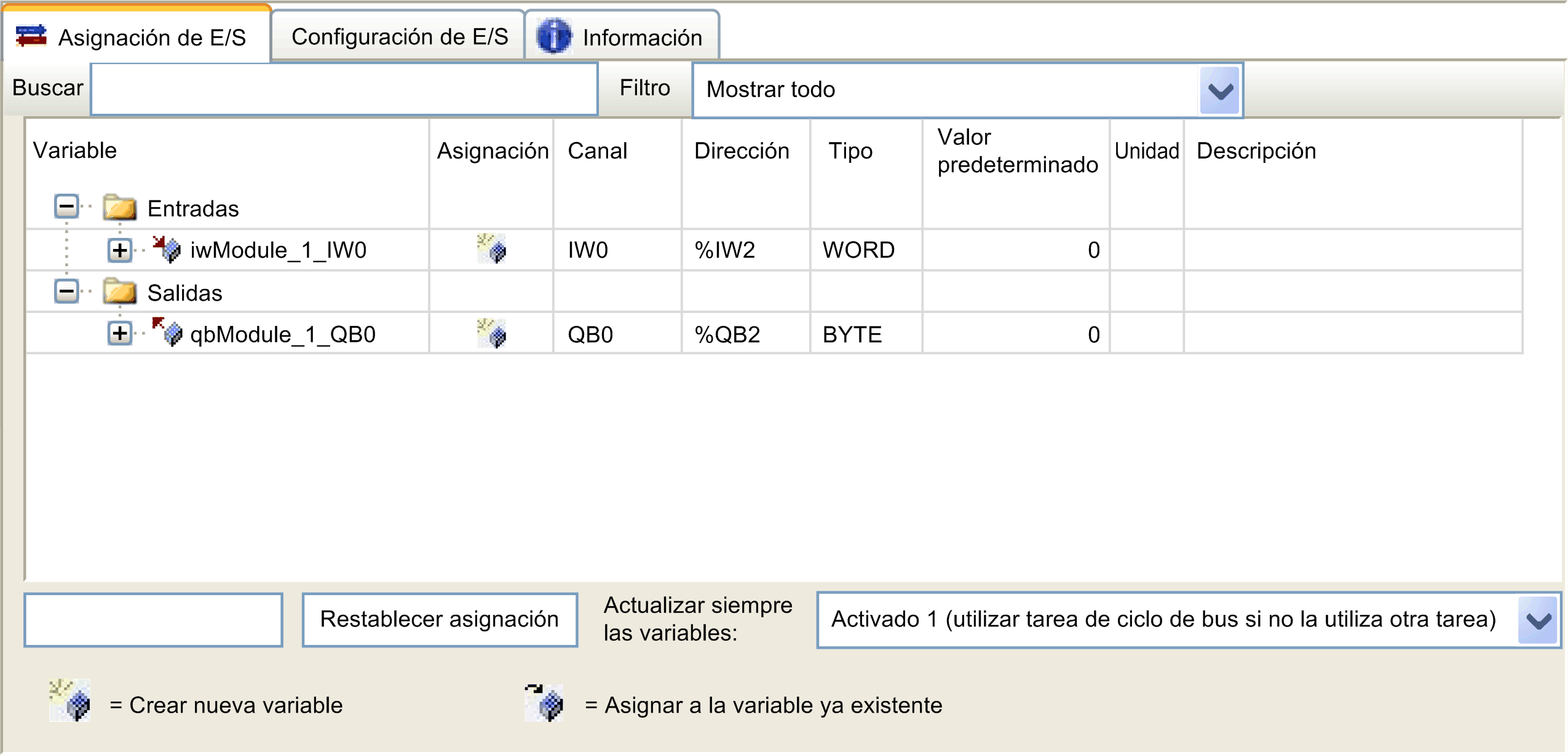NOTA: Si el canal se asigna a una variable existente, aparece la dirección correspondiente como texto tachado en la tabla.