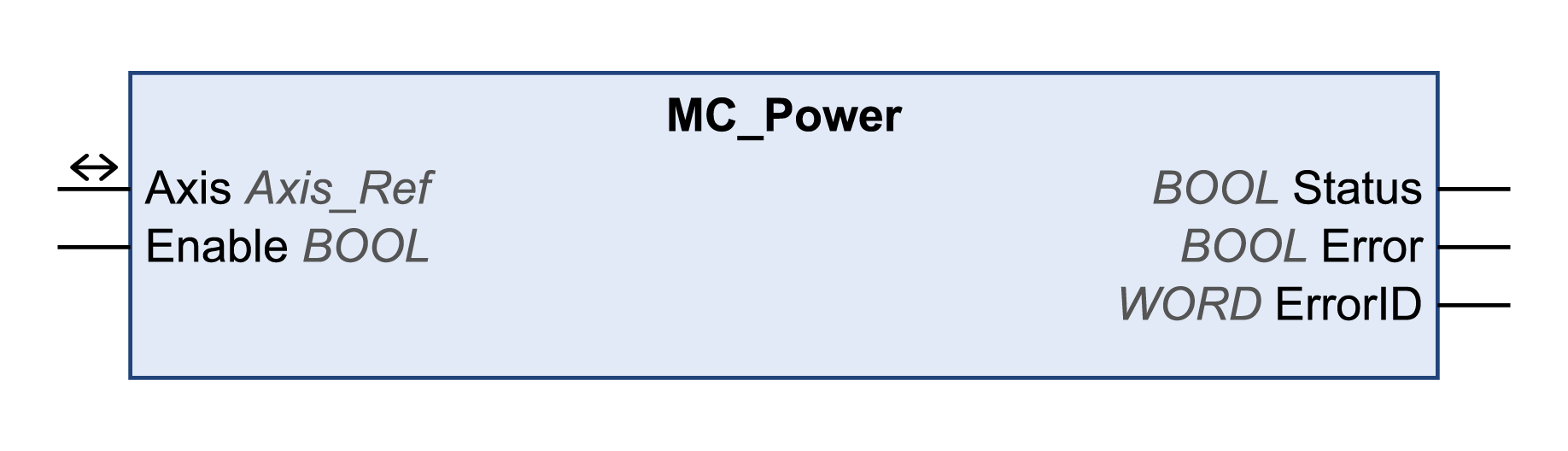 Ce bloc fonction ne peut pas être utilisé comme un bloc fonction Enable général. Chaque fois que le bloc fonction est appelé, l'entrée Enable est comparée à l'état de la sortie. Si ces valeurs sont différentes, une nouvelle commande est exécutée, soit pour activer la phase d'alimentation (Enable = TRUE et Status = FALSE) soit pour désactiver la phase d'alimentation (Enable = FALSE et Status = TRUE). La fonction doit être appelée tant que l'état demandé pour la phase d'alimentation est atteint ou jusqu'à la génération d'erreurs. En cas d'erreur d'un bloc fonction (par exemple, timeout), la sortie Error est définie, puis réinitialisée à nouveau avec l'appel suivant du bloc fonction.