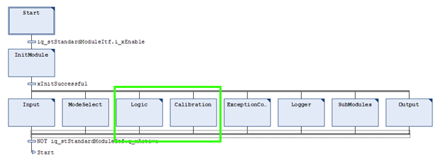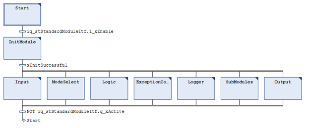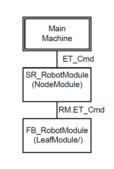 Under the MainMachine (called in SR_MainMachine.SubModulesAction), is a NodeModule (named SR_RobotModule) and under the SR_RobotModule the FB_RobotModule of the library RoboticModule is called (called in SR_RobotModule.SubModulesAction).