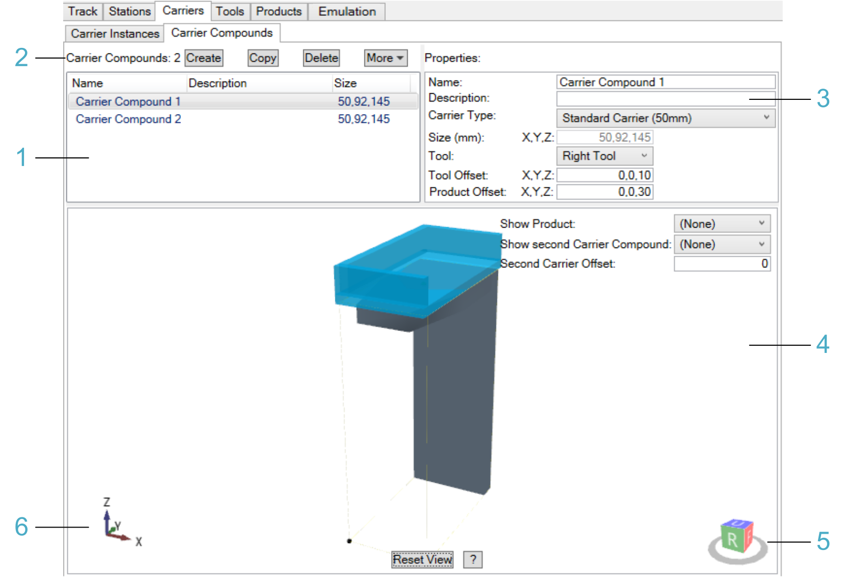 The View area displays the selected carrier compound with tools and products in a simplified 3-D graphical representation. |