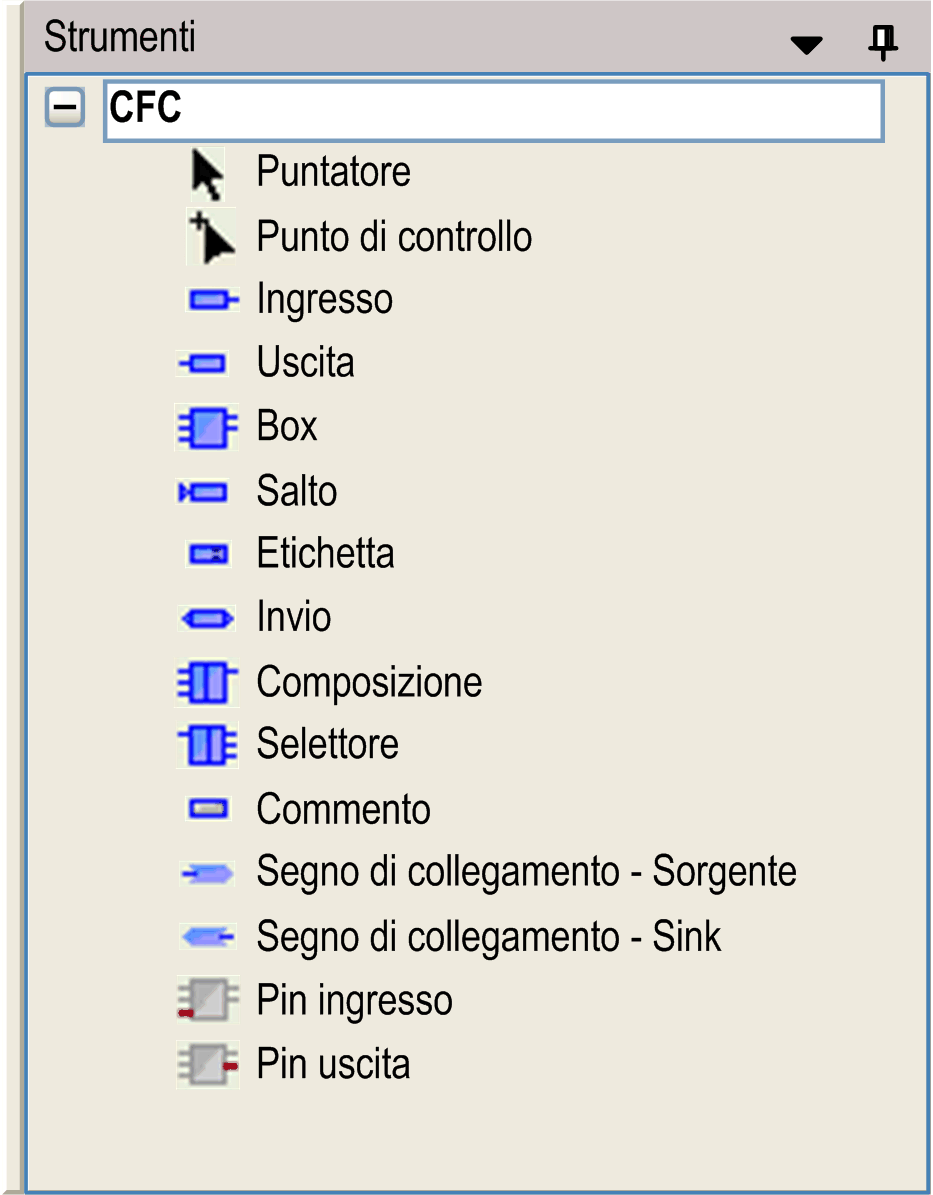 Gli elementi grafici disponibili per la programmazione nella finestra dell'editor CFC sono inclusi negli strumenti. Aprire gli strumenti in una finestra di vista eseguendo il comando del menu .