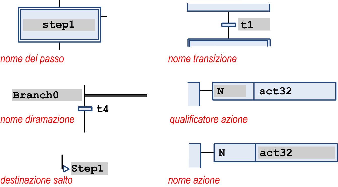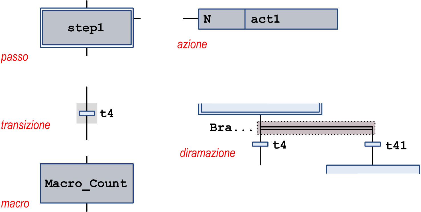 Le possibili posizioni del cursore in un diagramma SFC nell'editor SFC sono indicate da un'ombreggiatura grigia quando si passa il cursore sopra gli elementi.