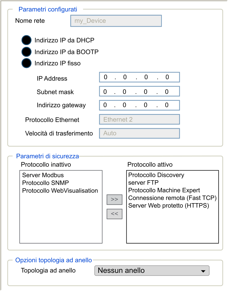 , fare doppio clic su oNota: Quando ci si trova in modalità online si vedono entrambe le finestre, ma non è possibile modificarle. Se ci si trova in modalità offline, viene visualizzata la finestra Parametri configurati e per Ethernet_2 la finestra Opzioni di topologia ad anello. È possibile modificare queste impostazioni.
