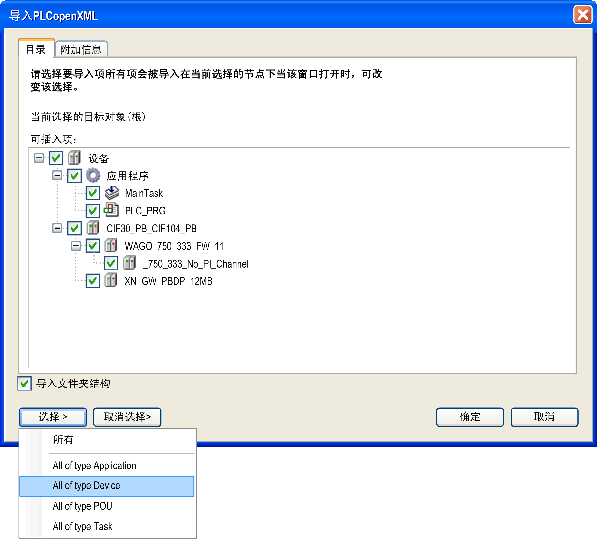 命令,可用 PLCopen 格式导入用于描述对象的 XML 文件的内容。您可以通过执行执行此命令可打开用于浏览文件的 Windows 对话框。过滤器会自动设置为 。选择所需的文件,然后通过单击 确认。将会打开 对话框。该对话框提供了两个选项卡: 和 。