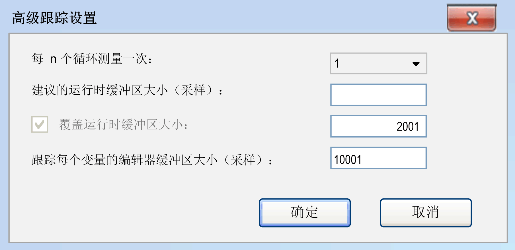 如果在包含对话框中单击了 按钮,则会打开 对话框。它包含用于数据记录的设置,如运行时或开发系统上被跟踪编辑器读取的缓冲区大小。应用程序记录数据的时间间隔根据任务配置来得到。