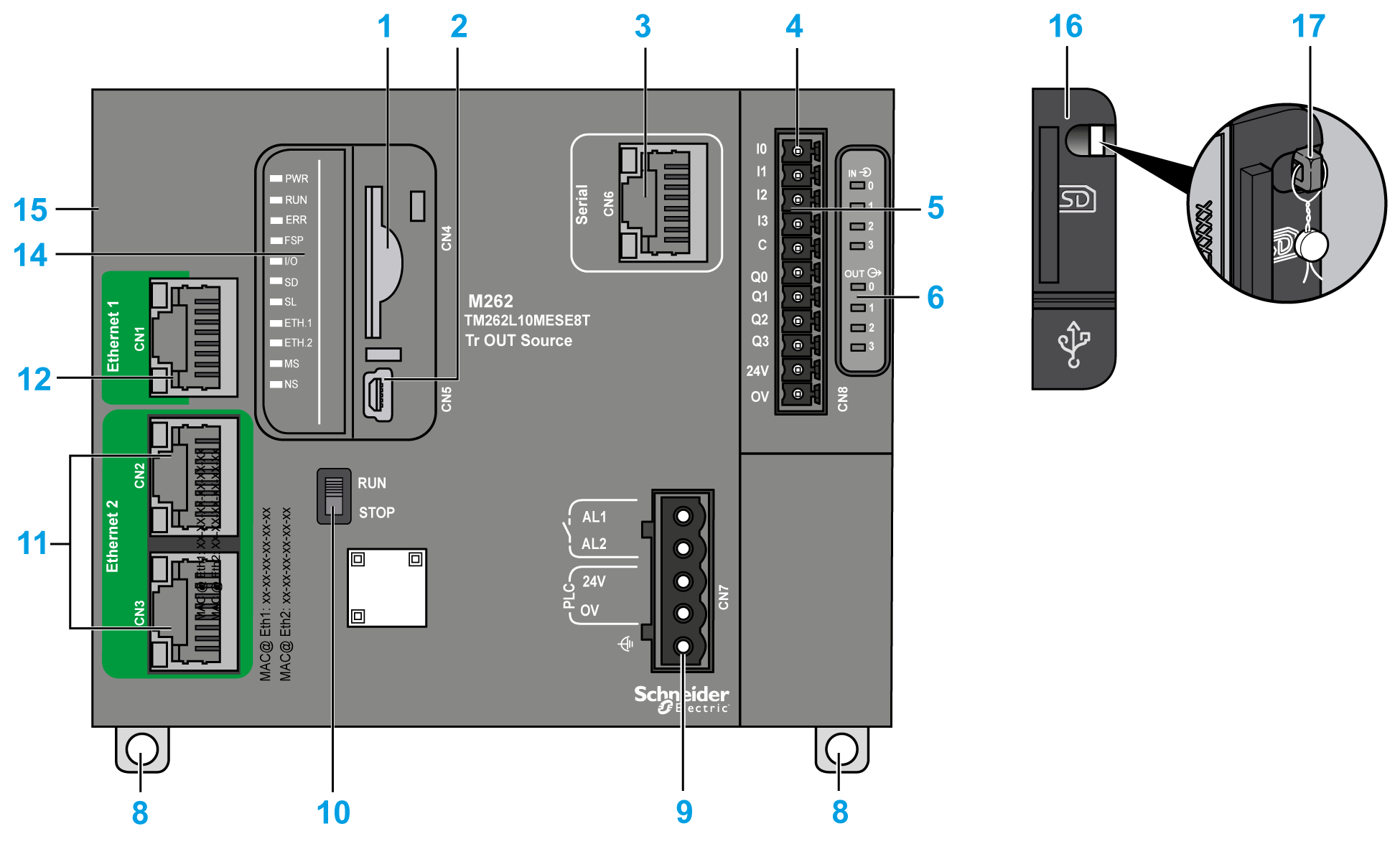 下图显示了 TM262L10MESE8T 逻辑控制器的各个组件: