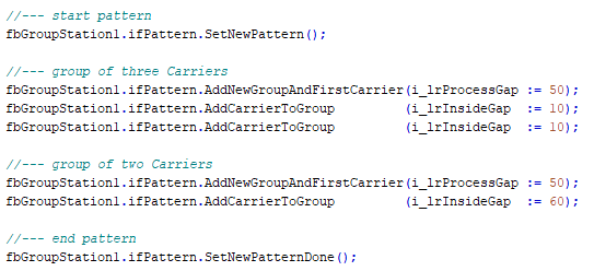 Mit den Methoden der Schnittstelle IF_GroupingPattern können Sie ein Muster für die Gruppierung von Carriern erstellen. Dieses Muster wird innerhalb des Funktionsbausteins FB_GroupingStation geladen.