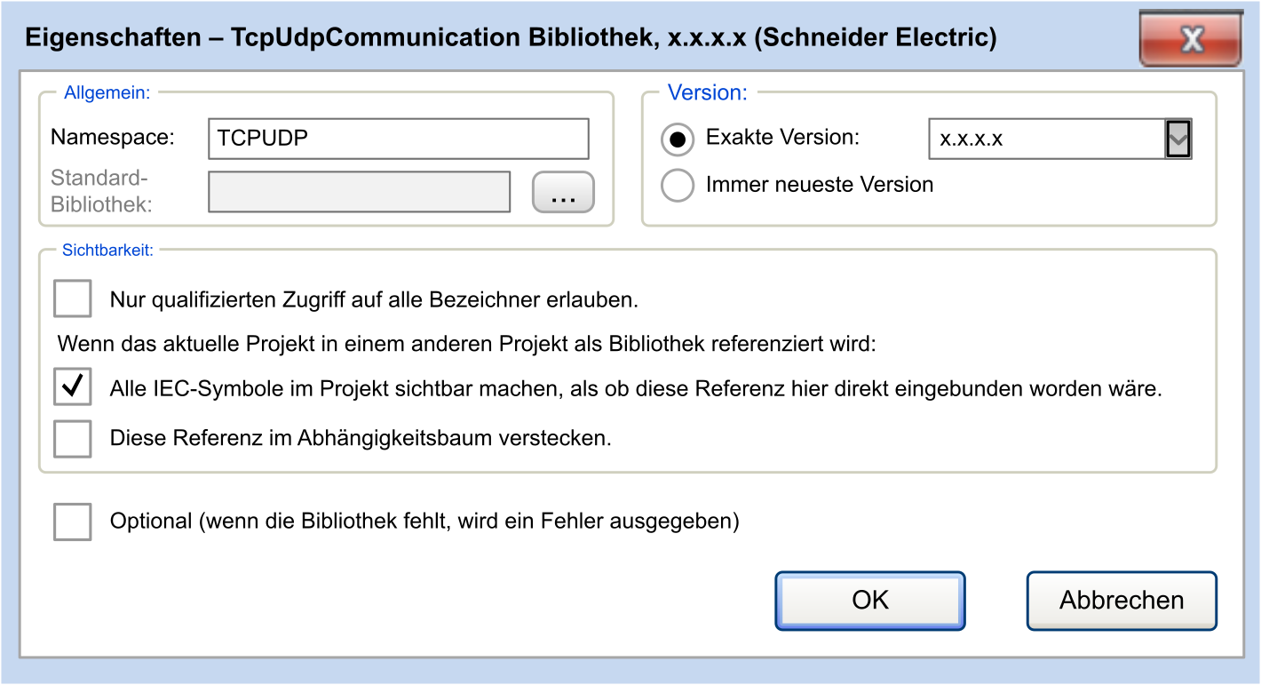 auf die Schaltfläche , um den Dialog für die ausgewählte Bibliothek zu öffnen. Er ermöglicht Ihnen, den Namensraum, das Versionshandling, die Verfügbarkeit und die Sichtbarkeit von Bibliotheksreferenzen zu konfigurieren.Dialogfeld
