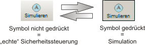 Bei gedrücktem Symbol ist die Simulation aktiv und die Befehle, die Sie ausführen, wie z.B. 'Senden' oder 'Variablenstatus', beziehen sich auf die Simulation.