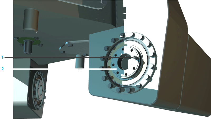 Verify whether the flange surfaces of the gearbox (2) and of the upper arm are free from grease and oil. If necessary, remove grease and oil residues from the upper arm. |
