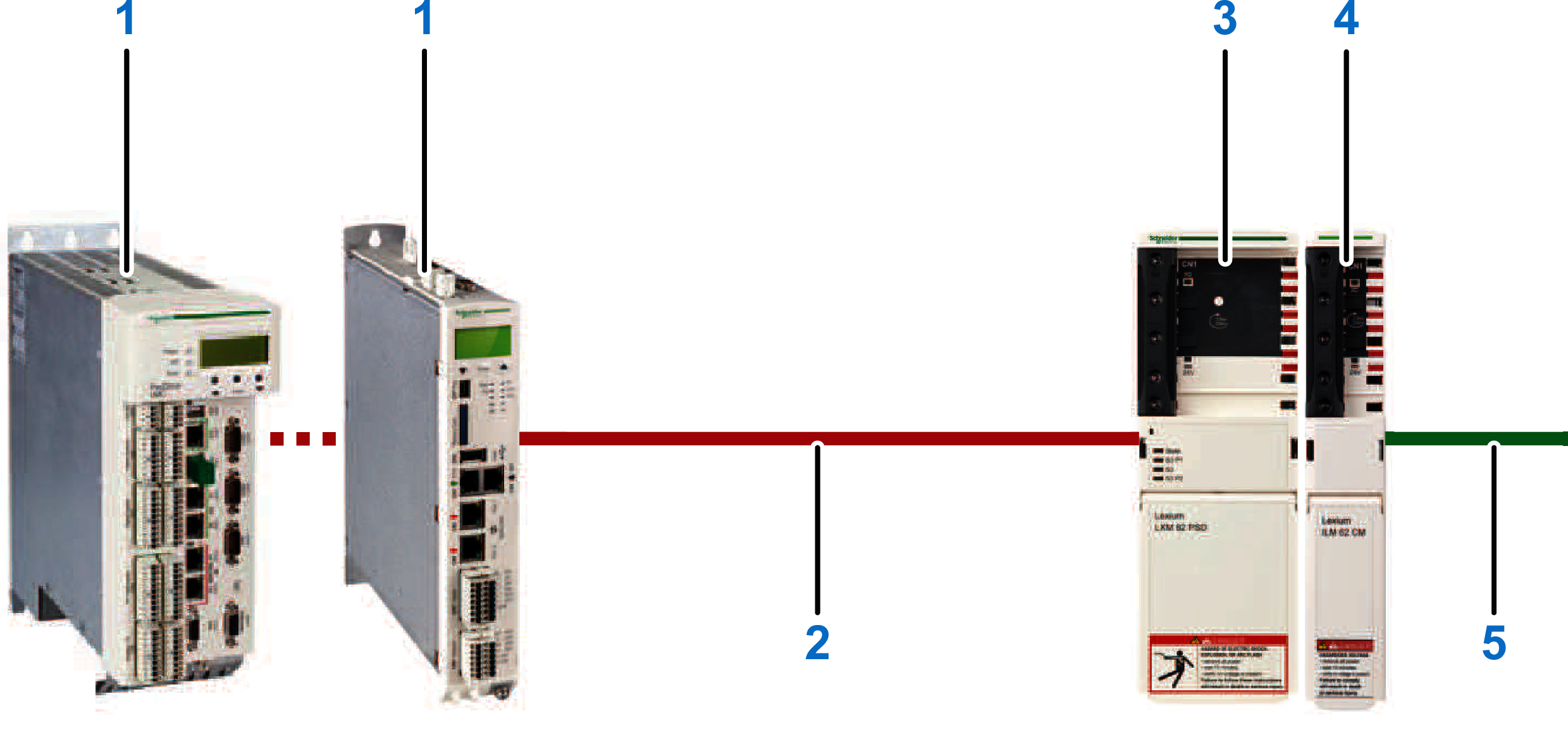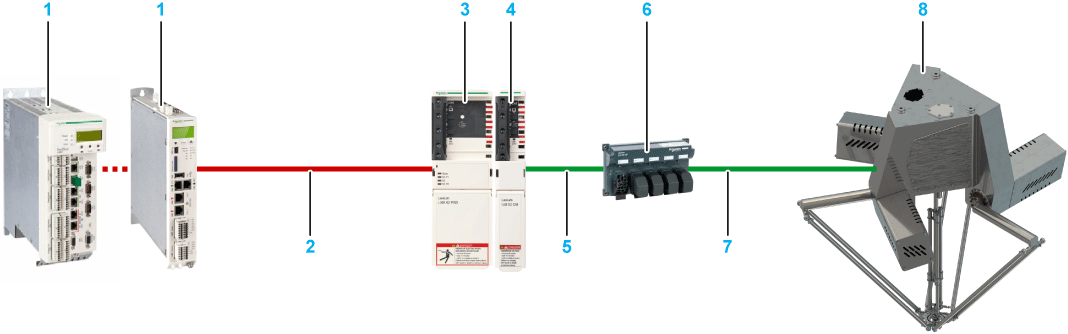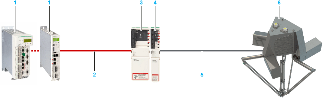 The following figure presents an example of a system setup for one Lexium P robot with SH3 motors and Lexium 62 ILD Detached Drive. At a minimum, this is the equipment required to achieve performances described in this guide.