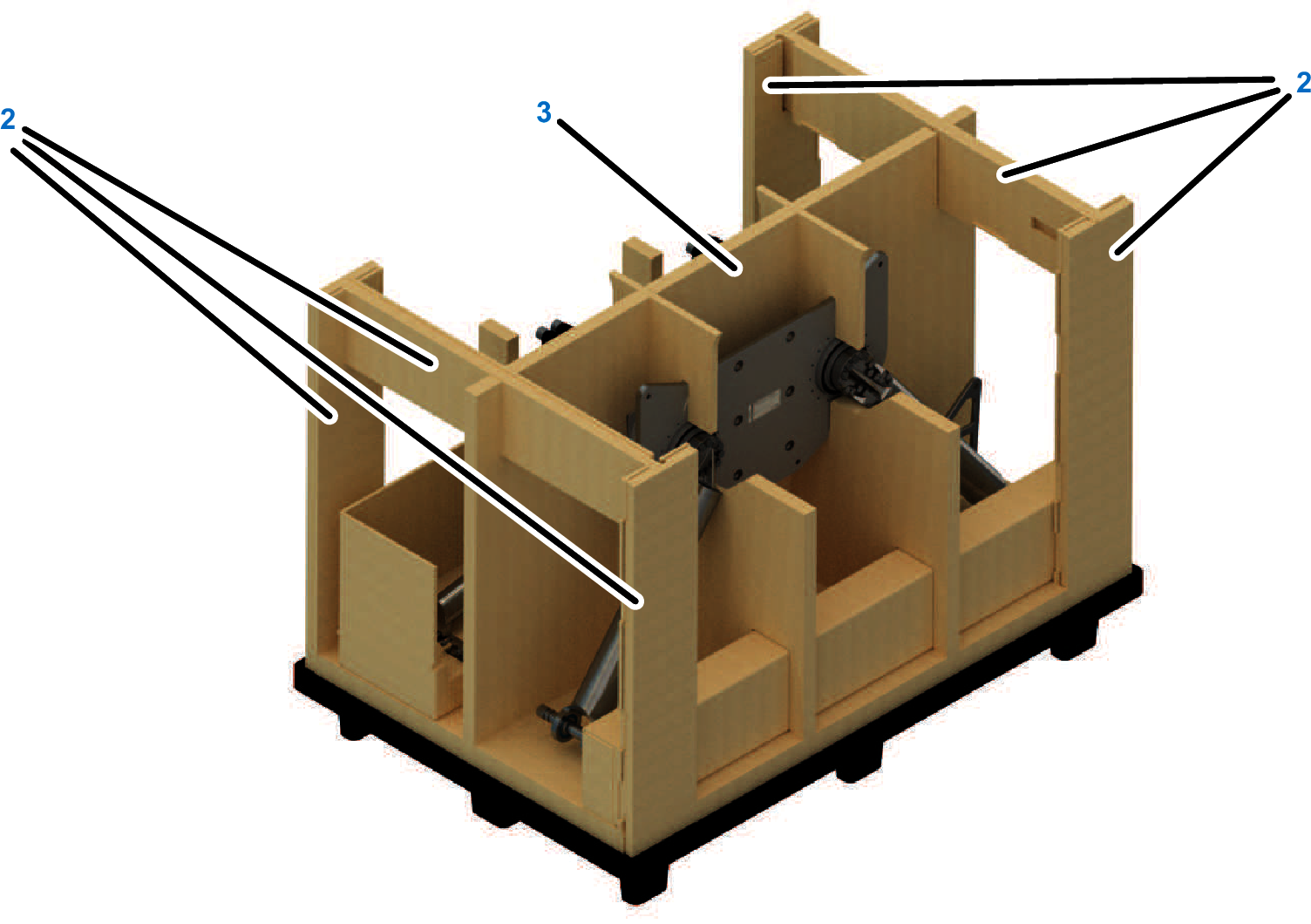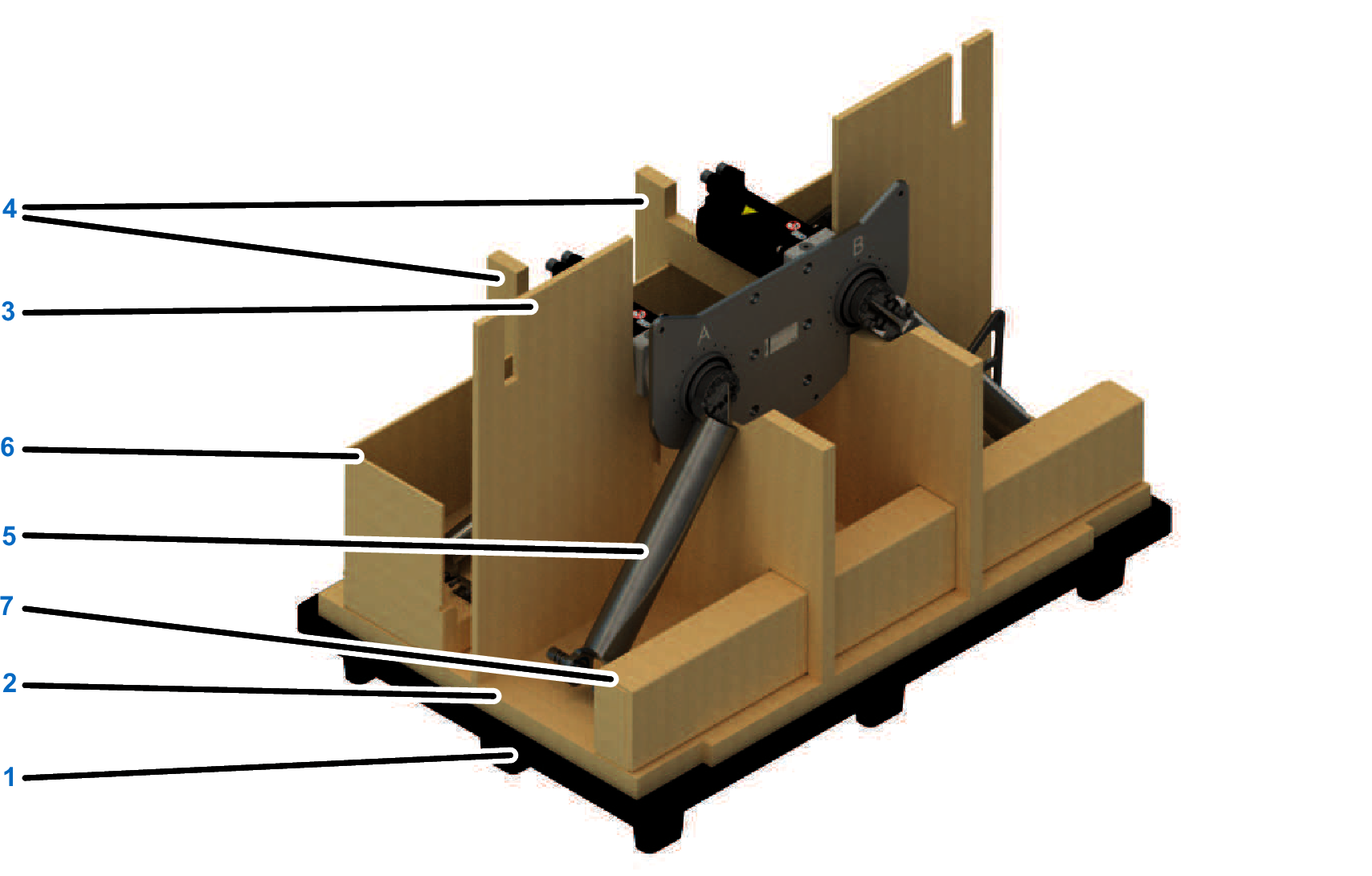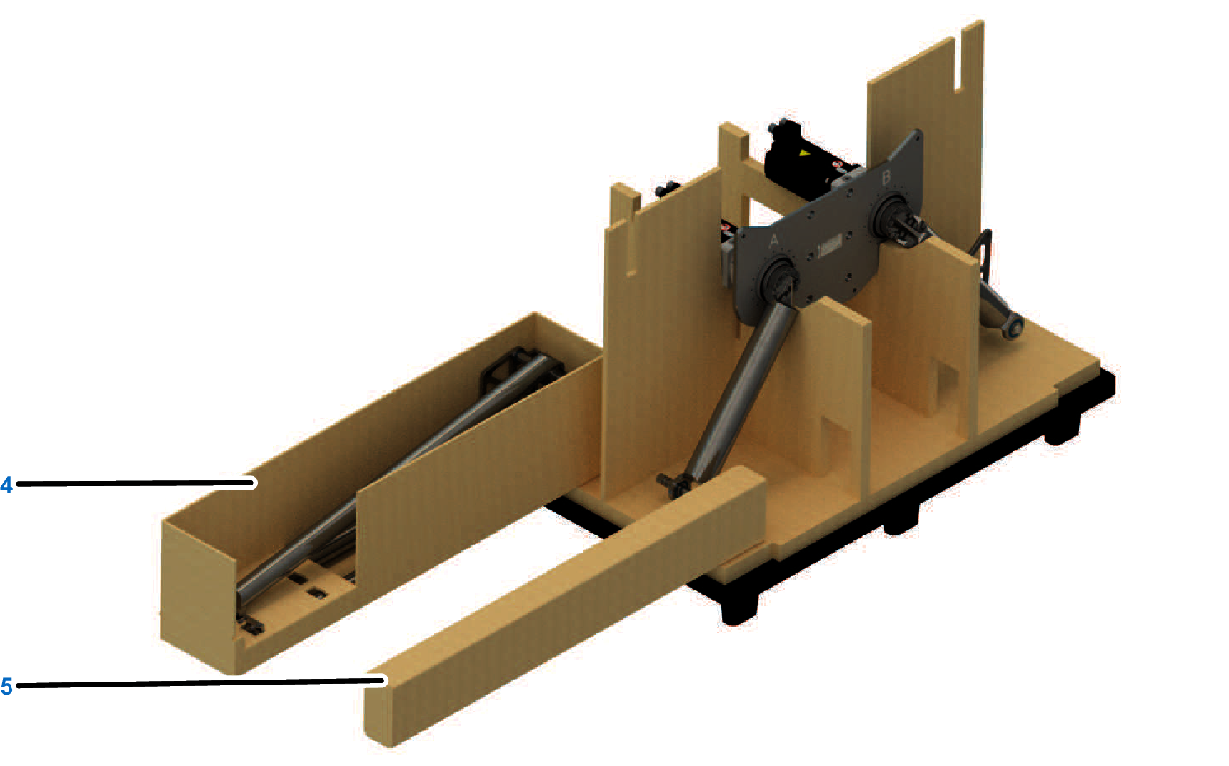 Slide out the insert carton robot arm (4) and the accessories carton box (5) to the left or right and verify it for transport damage.