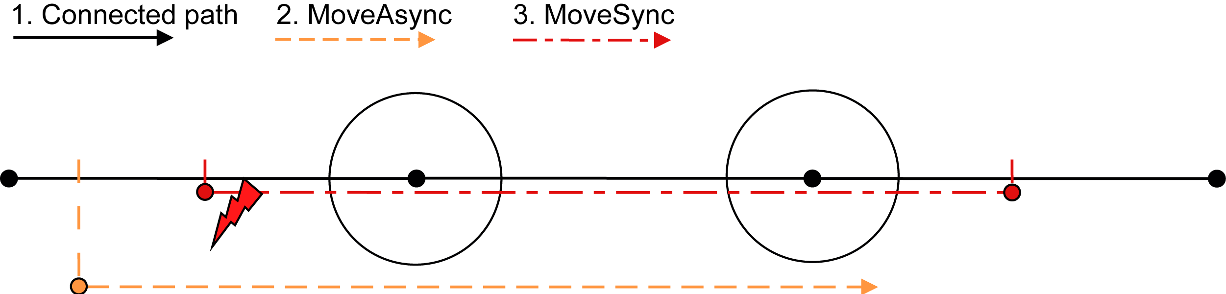 If a move command MoveSync (2.) was sent to the robot, either for the connected path or for a next connected path, it is not possible to send a move command MoveAsync (3.) which starts before the synchronous movement is completed.