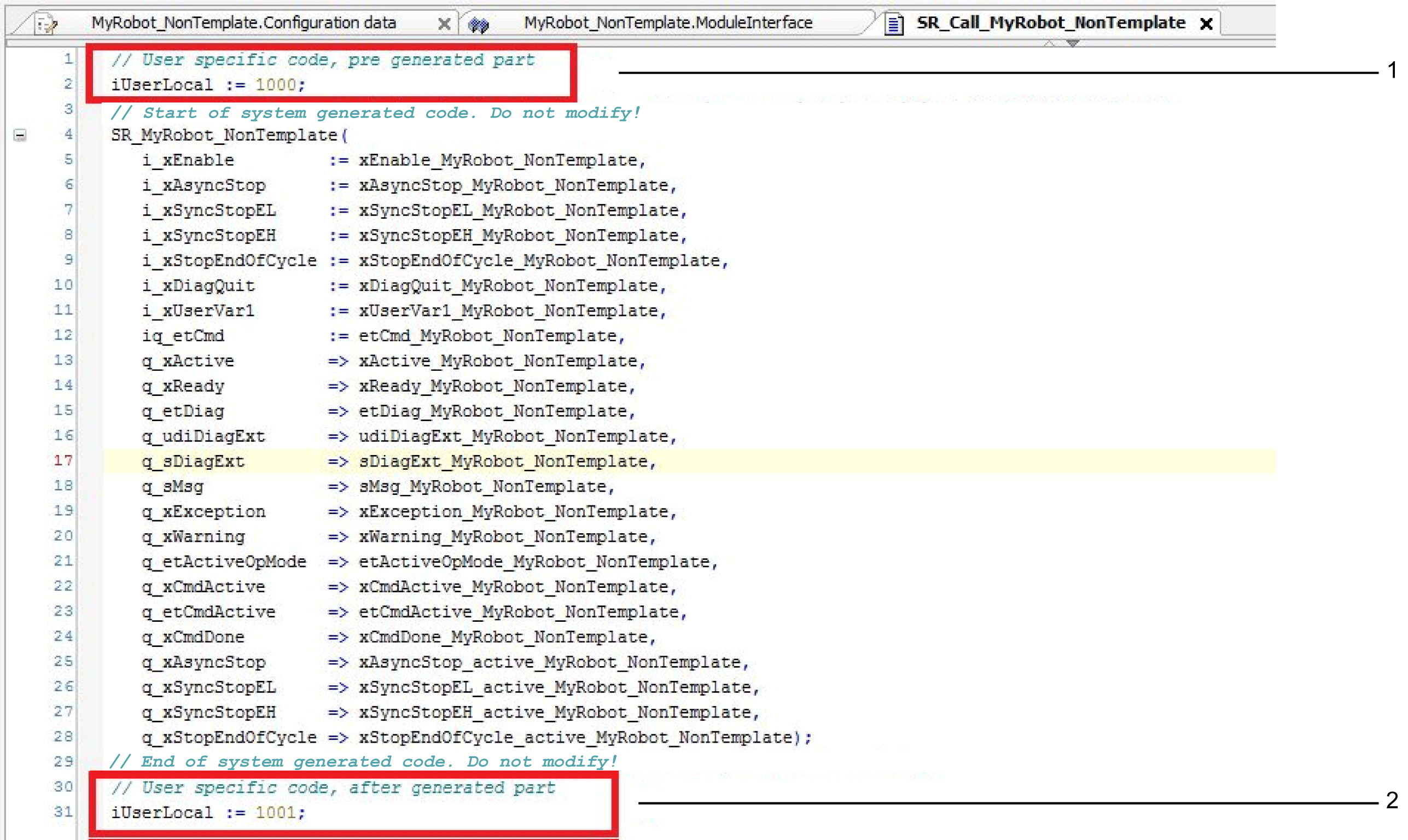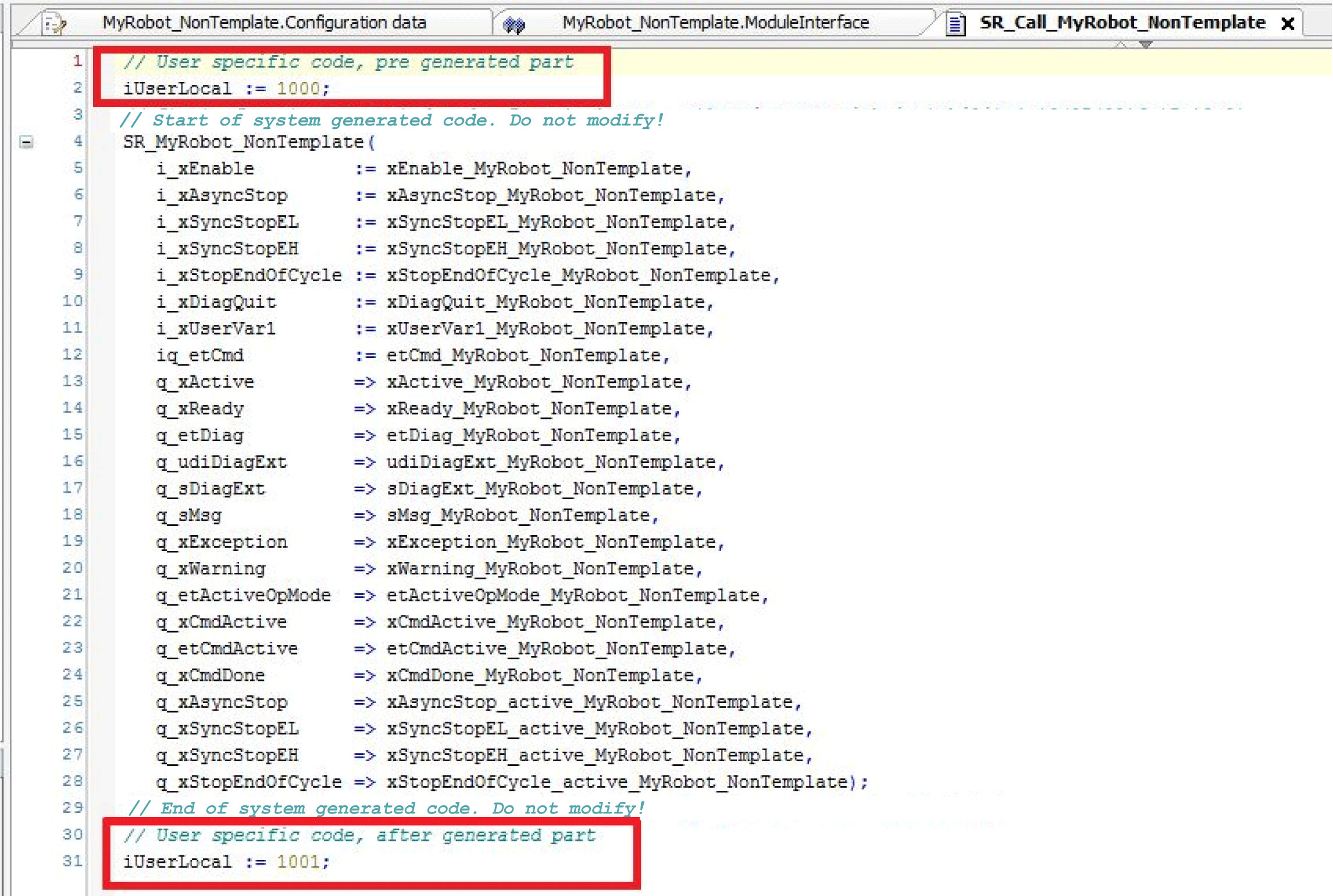 Only integrate additional user-specific code in the body of the generated program call at the following positions: