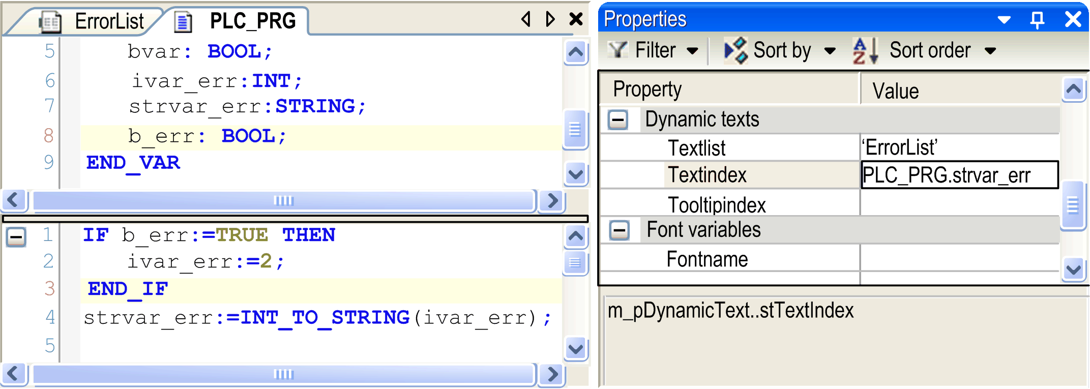 / . If you specify a text list name combined with the text index ( ) - which can be entered directly or by entering a project variable which defines the ID string - the text can be modified in online mode.A dynamic text list must be exported if it is needed as a language file for language switching in a target visualization. Specify the file path in the