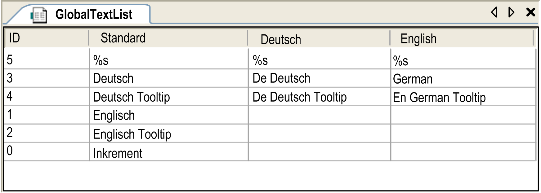 Each text list is uniquely defined by its namespace. It contains text strings which are uniquely referenced within the list by an identifier (ID, consisting of any sequence of characters) and a language identifier. The text list to be used is specified when configuring the text for a visualization element.