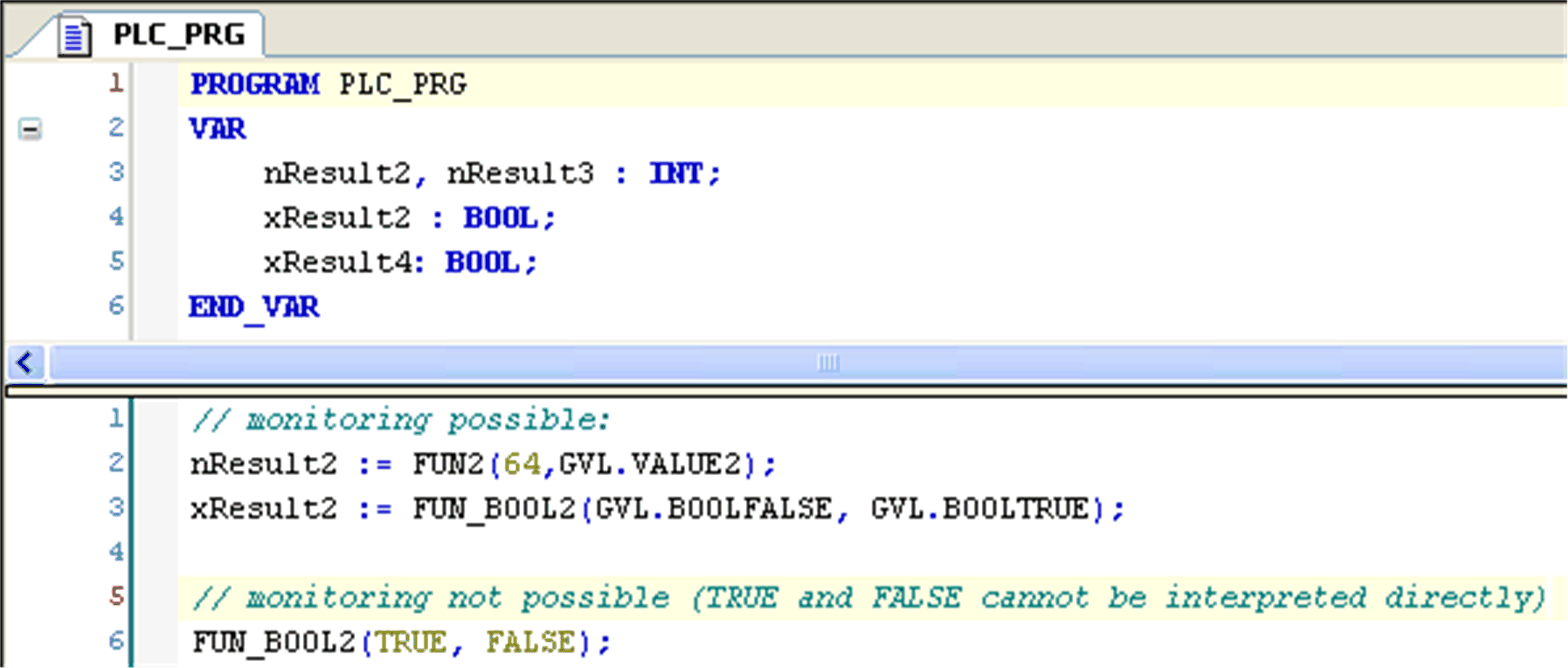 in the line above the function declaration. You can then monitor this variable in the text editor view in online view of the POU in which a variable gets assigned the result of a function call. You can also add the variable to a watch list for the same purpose. To get the variable immediately provided within a watch view, execute the command .