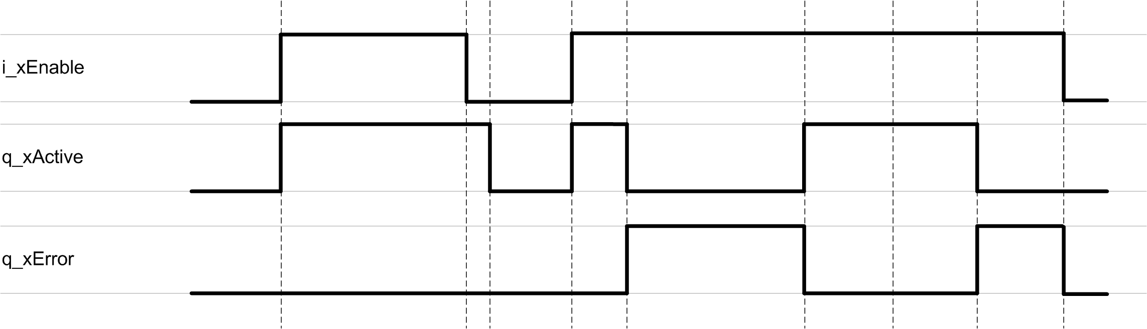 A rising edge of the input i_xEnable starts the cyclic data exchange between the function blocks and the selected avatar. As long as i_xEnable is TRUE, the cyclic data is exchanged at every controller cycle. A falling edge of the input i_xEnable stops the data exchange after the on-going communication has been terminated, and the values of the outputs are set to zero.