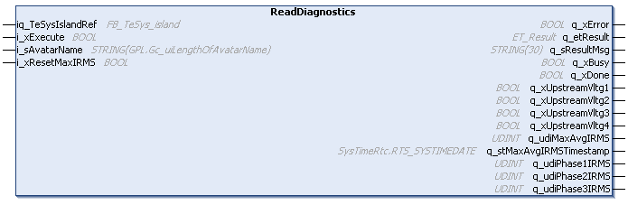 The function block ReadDiagnostics returns the diagnostic information and resets the maximum IRMS register of the selected avatar.