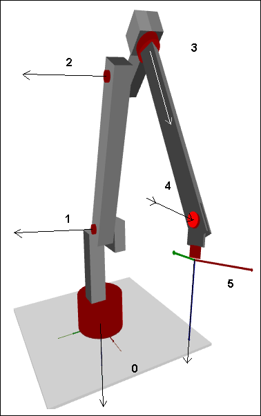 implement forward and inverse transformations of an articulated arm robot with six rotational axes. In the image, the Cartesian coordinate system is marked below at axis 0. The Z axis points downwards and the X axis points forwards in the direction of the tool center point (TCP). The origin of the Cartesian coordinate system is the intersection axis 0 and the underside of the robot.