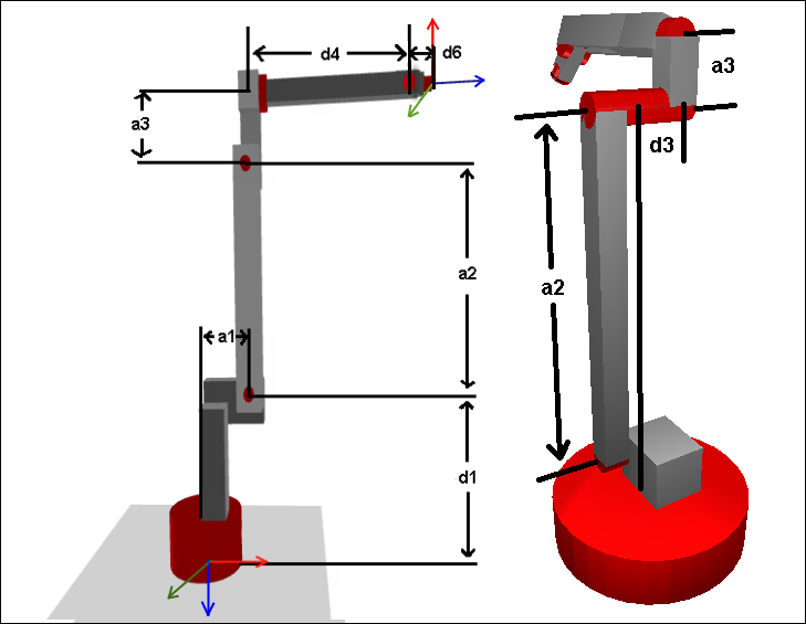 . The names and signs of the parameters are in accordance with the Denavit–Hartenberg convention. The image on the right shows the additional Denavit–Hartenberg parameter d3