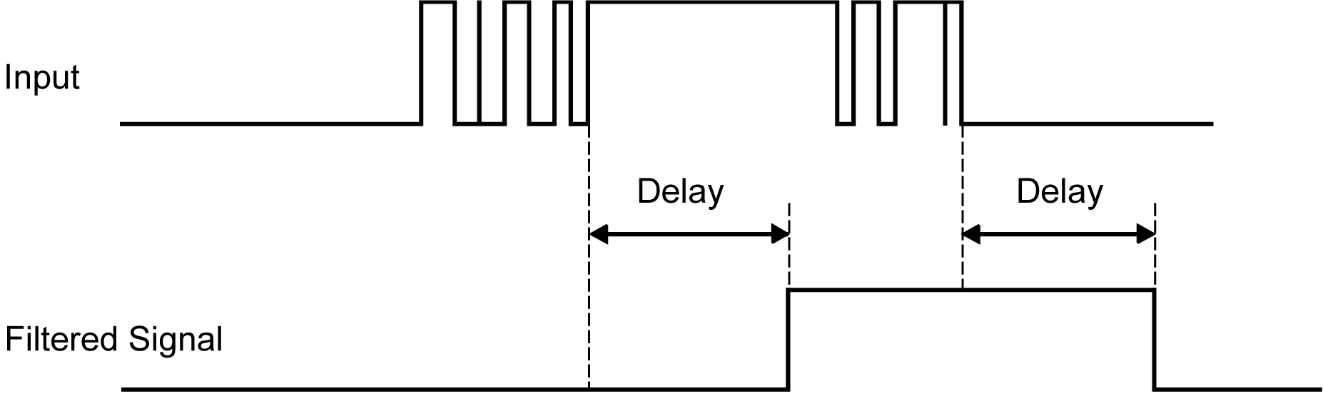 The bounce filter is designed to reduce the bouncing effect at the inputs. Setting a bounce filter value allows the controller to ignore some sudden changes of input levels caused by electrical noise. The bounce filter is only available on the fast inputs.