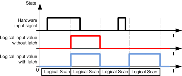 Latching is a function that can be assigned to the M241 Logic Controller fast inputs. This function is used to memorize (or latch) any pulse with a duration that is less than the M241 Logic Controller scan time. When a pulse is shorter than one scan, the controller latches the pulse, which is then updated in the next scan. This latching mechanism only recognizes rising edges. Falling edges cannot be latched. Assigning inputs to be latched is done in the tab in EcoStruxure Machine Expert.
