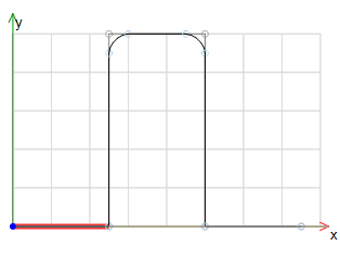 The example shows the curve of the function block, when the angle distance is larger than the half of the object. The following figure shows the curve with bSymmetricalDistances=FALSE. Here the object is too short, so it is smoothed up to the center of the angles (see the horizontal line).