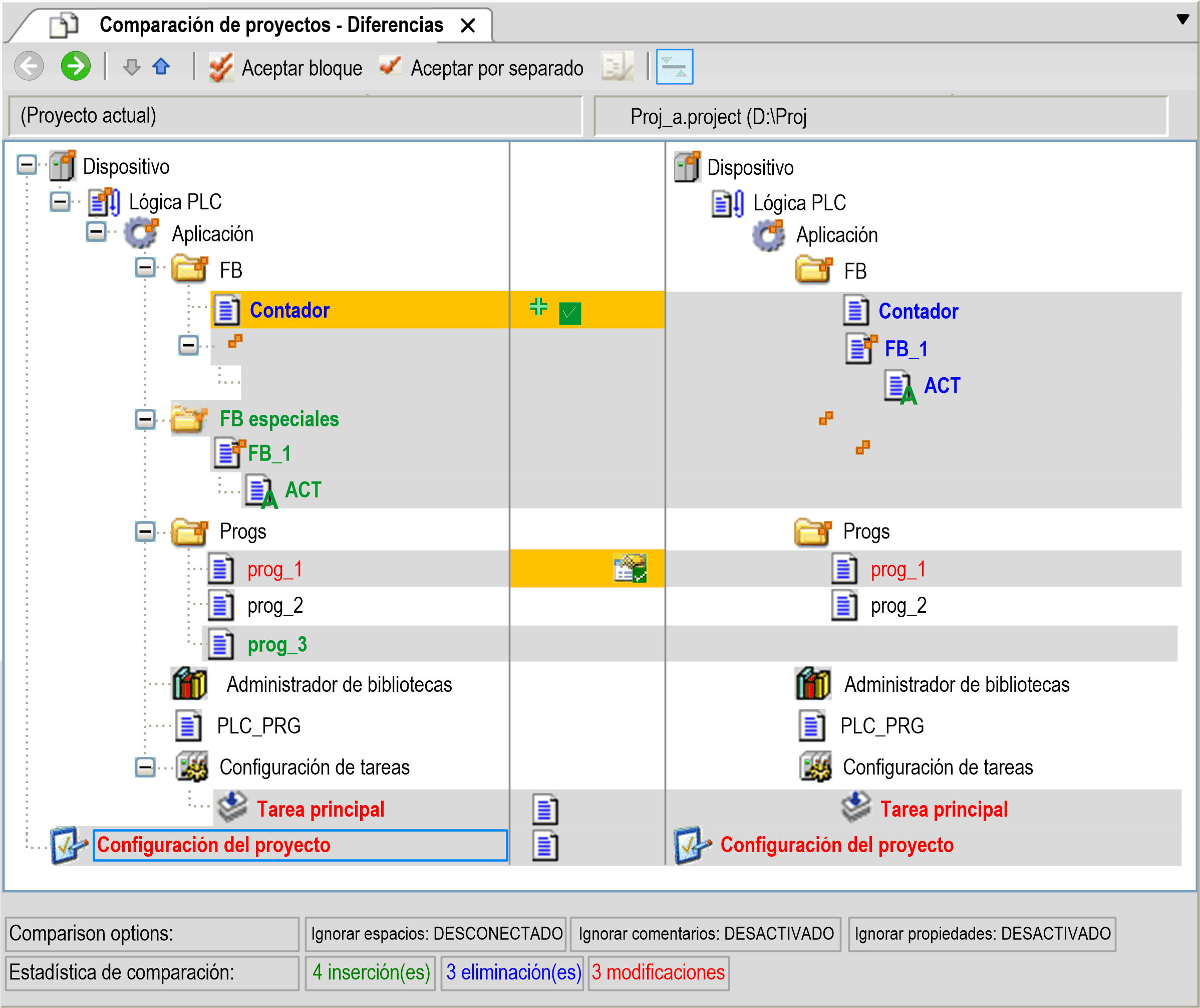La unidad (vista de los resultados de la comparación) o la entidad sobre la cual se coloca el cursor se aceptará en la versión incluida en el proyecto de referencia del . La dirección de la aceptación va del proyecto de referencia al , y no a la inversa.Después de aceptar una entidad en la vista , la entidad se mostrará resaltada en amarillo en la versión actual. Al volver a la vista de los resultados de la comparación, se le preguntará si desea confirmar las modificaciones. Si las dos versiones son idénticas, ahora se mostrarán en negro normal en los resultados de la comparación. No obstante, al aceptar una unidad individual en la vista de los resultados de la comparación, se resaltará en amarillo su nombre en el , además del nombre de todas las demás unidades de las que depende la unidad especificada. Asimismo, se añadirá una marca de verificación después de sus nombres. Al aceptar una unidad nueva insertada en la versión actual, esta y todas las unidades subordinadas se eliminarán y se marcarán las líneas correspondientes con un pequeño signo más de color rojo. Al aceptar una unidad eliminada en la versión actual, esta y todas las demás unidades de las que dependa se reinsertarán en la versión actual y sus nombres se marcarán con un pequeño signo más de color verde. Cuando introduzca una unidad, se le preguntará si desea confirmar estas modificaciones en la vista detallada. Si se repite el clic en el botón , se cancelan las modificaciones realizadas durante su última ejecución. |