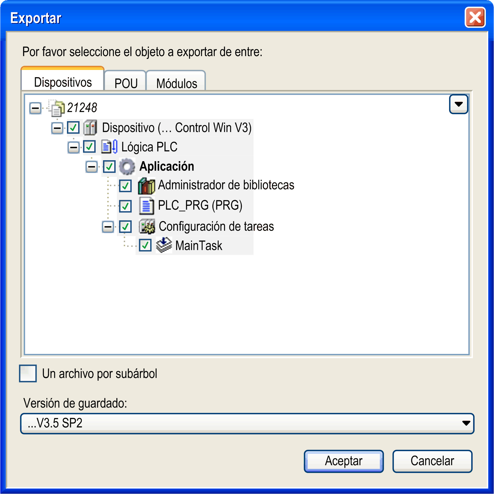 está activada, se generará un archivo de exportación por separado para cada subárbol disponible directamente debajo del nodo raíz, que contendrá los objetos seleccionados. A modo de ejemplo, vea los dos subárboles de la figura siguiente. Si la opción está desactivada, sólo se generará un archivo de exportación que contiene los objetos seleccionados.EcoStruxure Machine Expert en la lista. Cuando pulse y cierre el cuadro de diálogo, los objetos se exportarán en un formato que permite volverlos a importar con la versión seleccionada.