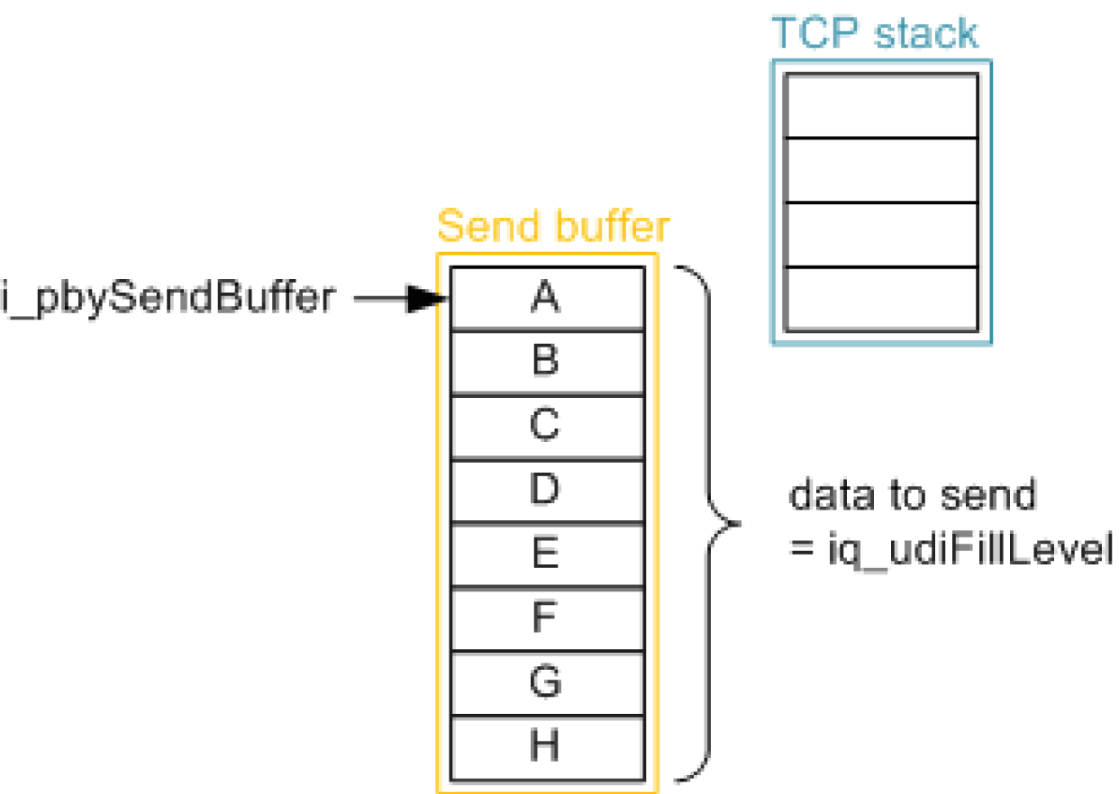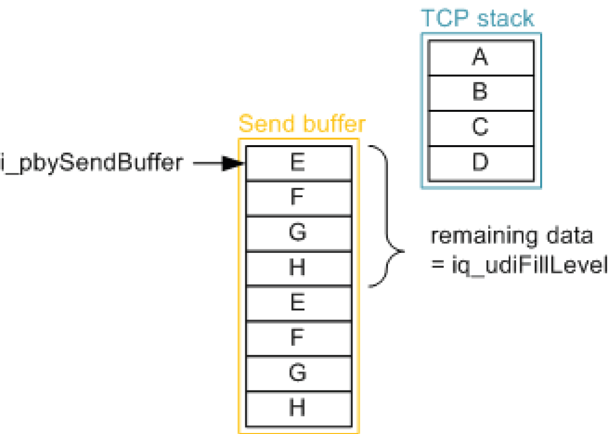 En los casos en que los datos no se hayan podido copiar por completo a la pila TCP del controlador en una llamada de función, se puede llamar varias veces la función de enviar correspondiente sin modificar el parámetro iq_udiFillLevel desde la última llamada de función y sin tener que mover datos dentro del búfer.