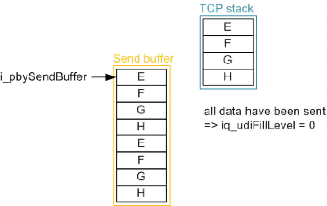Antes de la primera llamada de la función, el puntero se establece en el primer índice del búfer. El nivel de llenado se establece al número de bytes que enviar. En este ejemplo ilustrado, el búfer de la pila TCP está vacío y su tamaño es menor que el búfer de envío de la aplicación. |