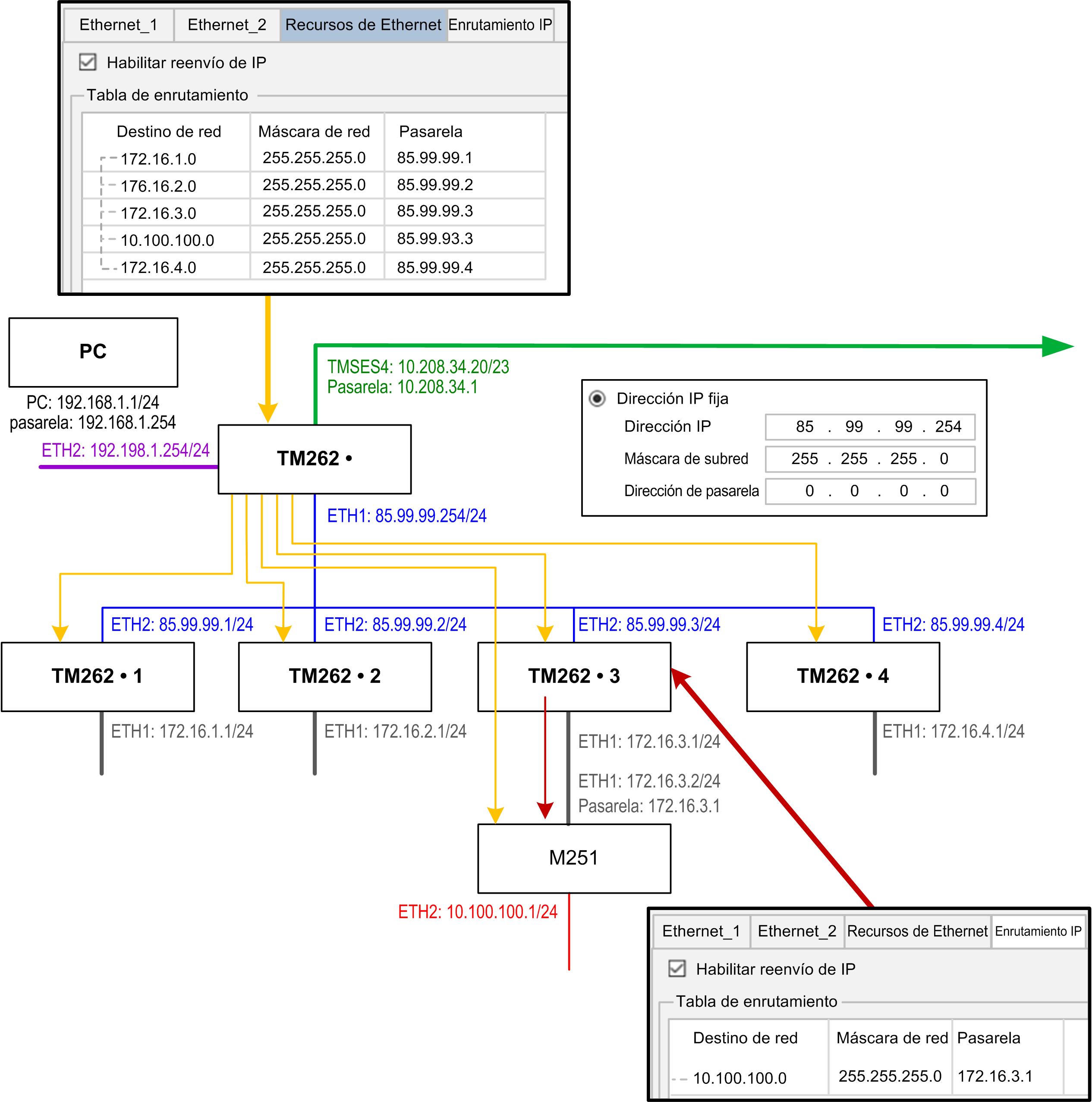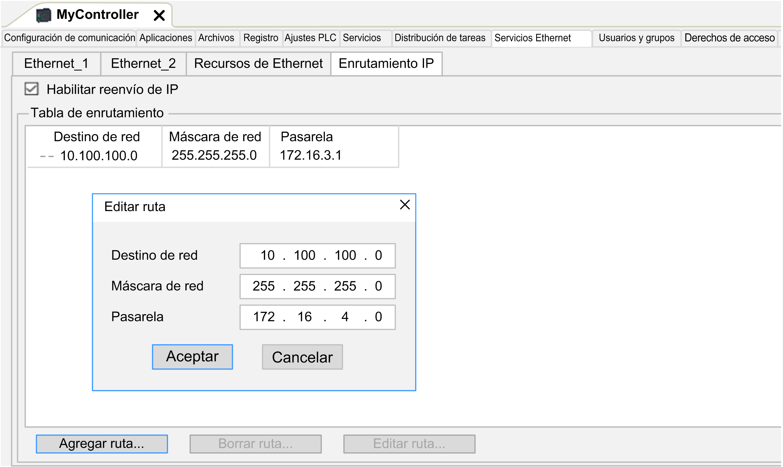 permite desactivar el servicio de reenvío deEl Modicon M262 Logic/Motion Controller puede tener hasta tres interfaces de Ethernet. Es necesario utilizar una tabla de enrutamiento para la comunicación con redes remotas conectadas a diferentes interfaces de Ethernet. La pasarela es la dirección IP que se usa para conectarse con la red remota, que tiene que estar en la red local del controlador.