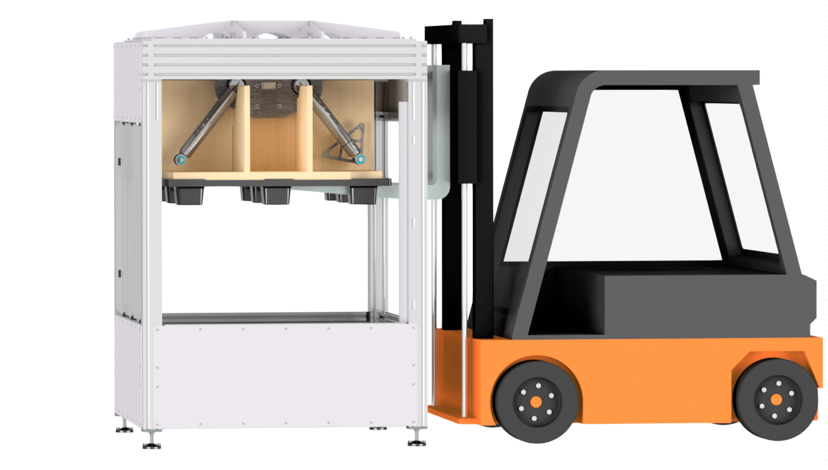 Using a forklift truck, lift the robot and the pallet into the enclosure.