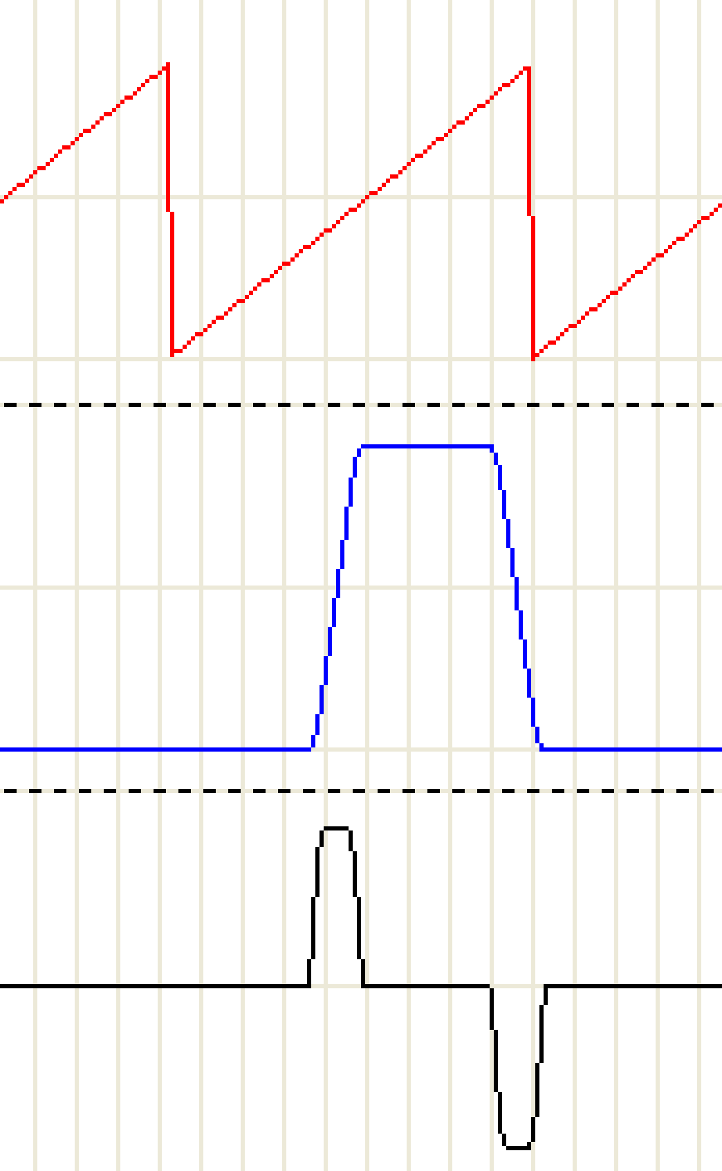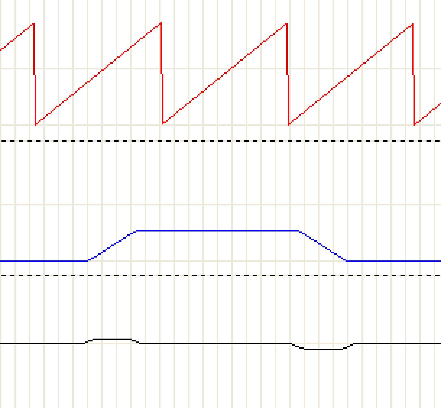 The following graphical illustration shows three different gear factors and their effect on velocity and acceleration of the trains. At the topmost position the position of the master is marked in red. Then the velocity of the trains in blue, and finally the acceleration of the trains in black.