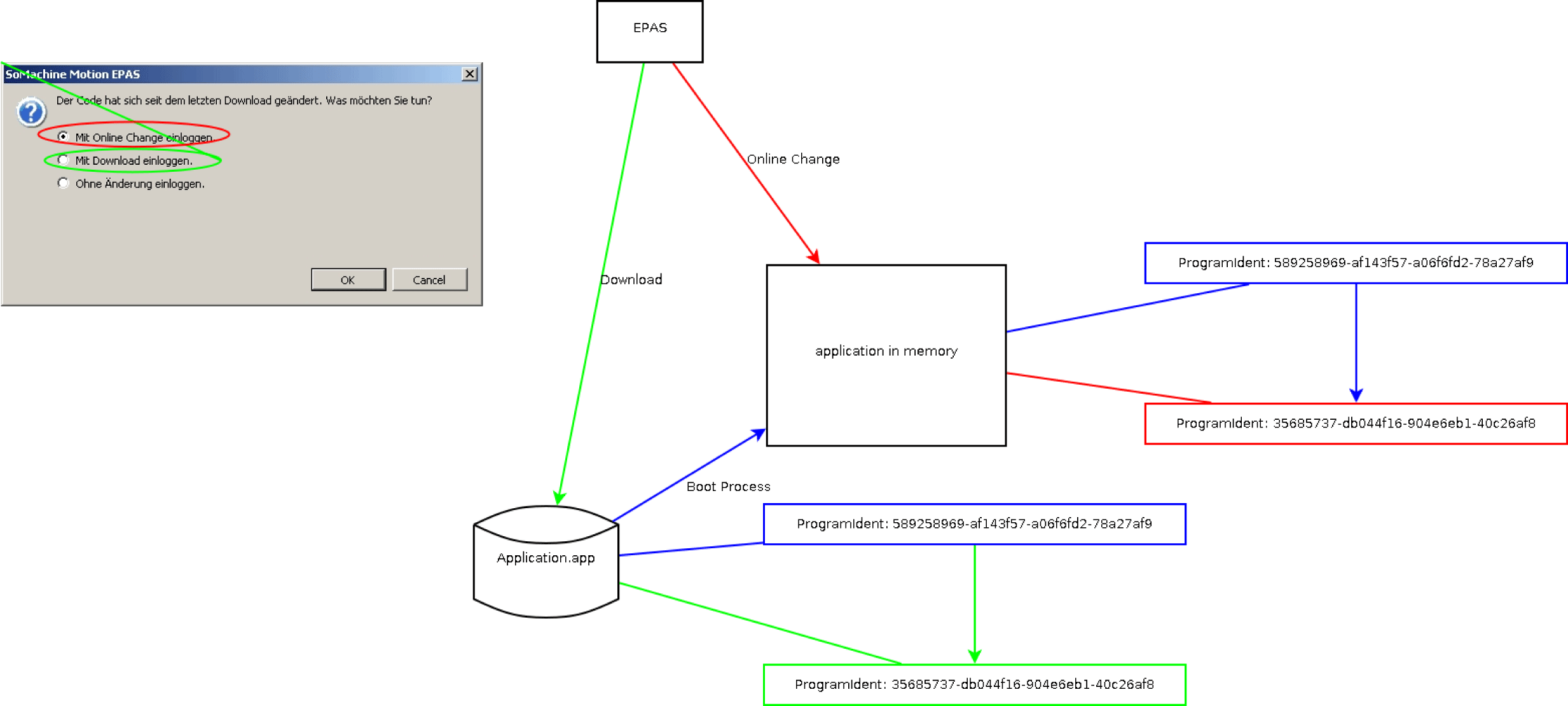 The application is loaded into the memory using Online-Change. At the end of the cycle, that is after the tasks have been processed, the changeover to the changed application is effected. This means that the ProgramIdent of the application in memory has also changed.