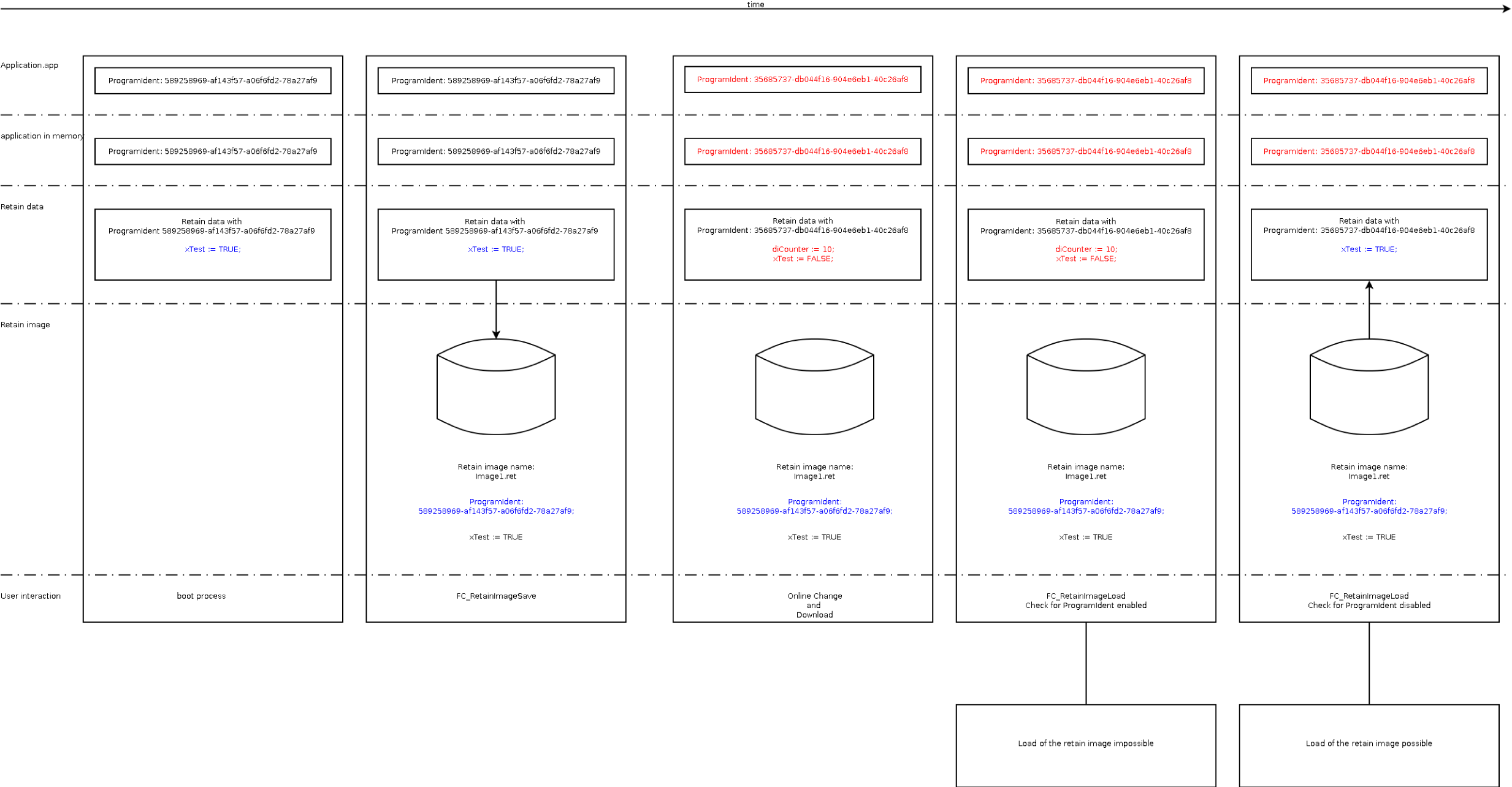 A change of the application in the memory via Online-Change may result in a change of the retain data. This leads to a change of the ProgramIdent of the application in the main memory. When loading a retain image, it is possible to check for a change of the ProgramIdent. If the check has been activated, the retain image is not loaded. If the check is deactivated, the retain image is loaded into the retain area. This may mean that the assignment of the retain data is no longer correct, and consequential errors may occur. The following illustration is to describe this behavior more clearly: