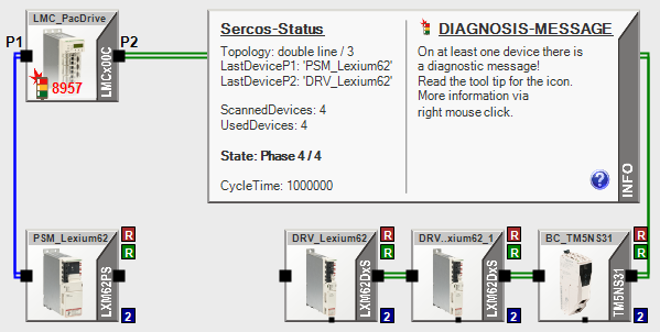 The physical connection between the devices PSM_Lexium62 and DRV_Lexium62 is interrupted (for example, cable disconnected). Due to the Sercos infrastructure redundancy, Sercos changes the topology from the previously set ring to double line as shown in the Info box (primary line at P1 of the controller, and secondary line at P2 of the controller, both with loop back). Once the connection between the two devices is re-established, Sercos re-establishes the ring the topology.