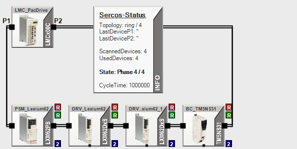 The following screenshot demonstrates a properly working Sercos bus with ring topology in communication phase 4: